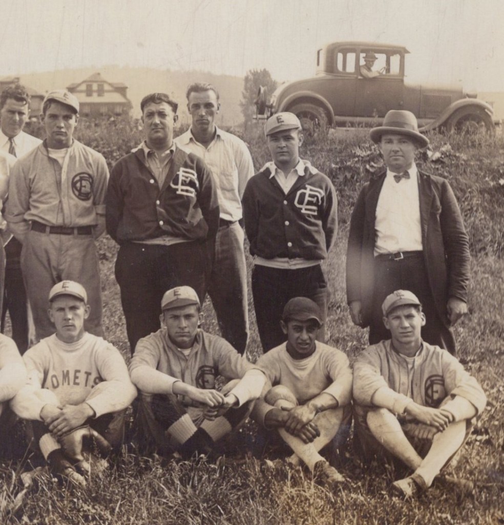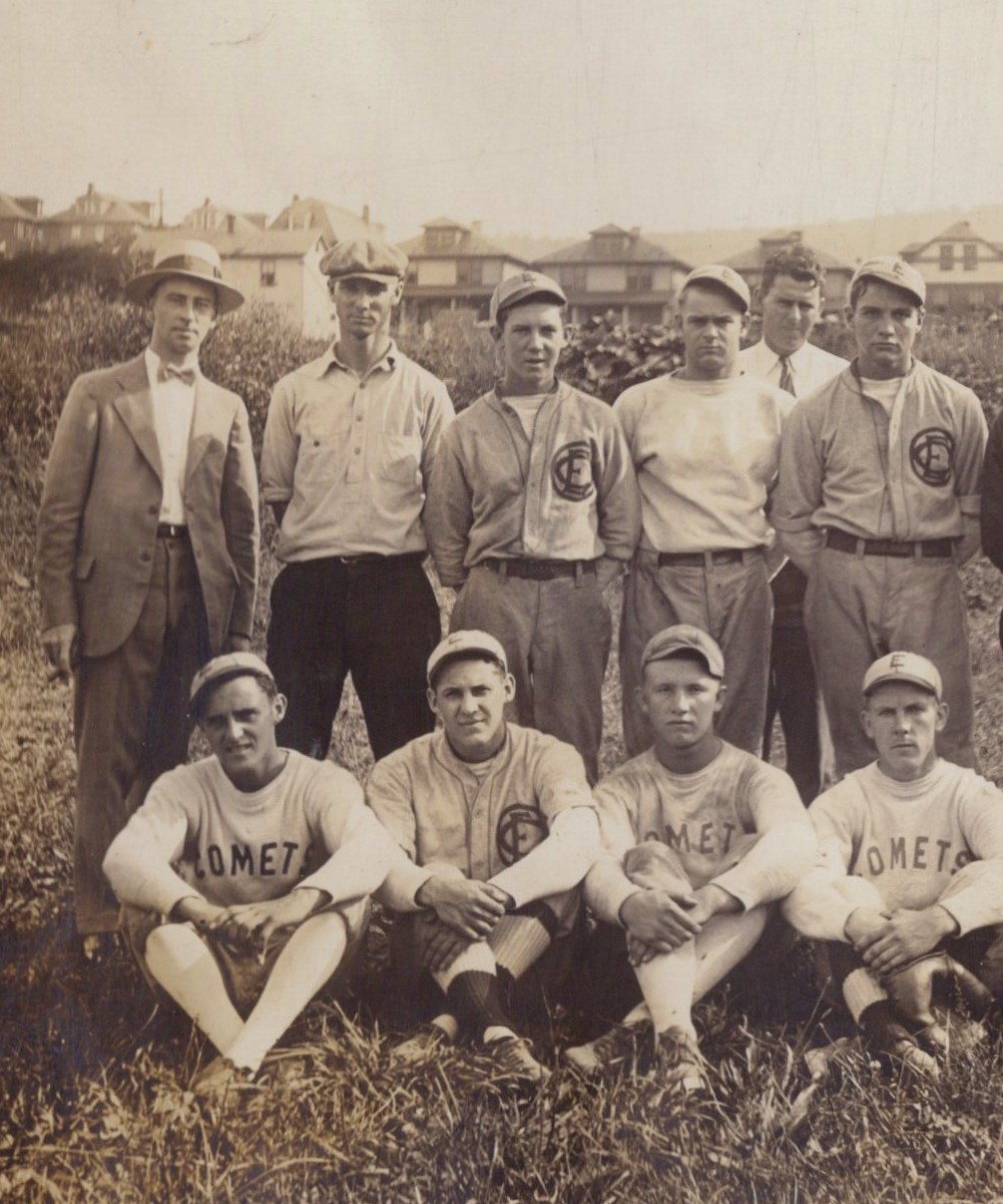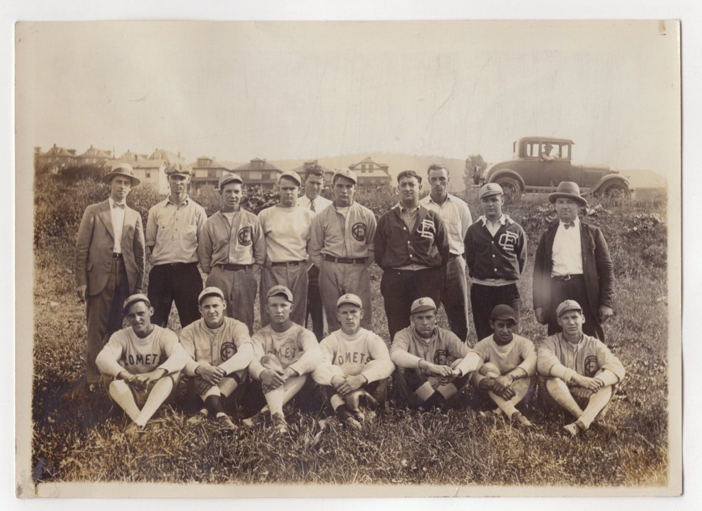 This vintage photograph features a women’s softball team. Judging by their smiles, the ladies were in a happy mood at the time this photograph was taken. The image was produced in the year 1934 which the text on the photo indicates celebrates “a century of progress”. Two of the players are wearing baseball caps but no baseball equipment or team logo is visible in the photograph. At that time in softball history, many leagues required the players not to use gloves. It is also notable that this team photo includes eleven players rather than the expected baseball nine. Women’s softball teams of that era employed ten players on the field with the tenth player occupying the position of short centerfield. Perhaps the eleventh player in the photo is the coach/manager or possibly a substitute. It is also interesting to note that “A Century of Progress” was the slogan for the 1933 World’s Fair.The exposition was held along the lakefront of Chicago, Illinois. The fair was operated from June 1-November 1, 1933, and May 26-October 31, 1934. It is a safe assumption that this image was taken at the Chicago Worlds Fair grounds. Softball was one of the few team sports available to women during the 1930’s, 1940’s,and 1950’s. During the 1930’s, softball was a very popular sport around the United States. In 1933 the newly established Amateur Softball Association sponsored the first national fast pitch softball tournament for women. The association tied the tournament to the Chicago Worlds Fair. In the initial competition, eight women’s teams competed against each other. It is worth mentioning that some sources report that the games were actually sponsored by a duo comprised of a sports writer and a sporting goods salesman. This wonderful memento of softball history measures 3″ x 4 3/4″ and based on the black paper residue on it’s reverse, once found it’s home in someone’s photo album. SOLD
