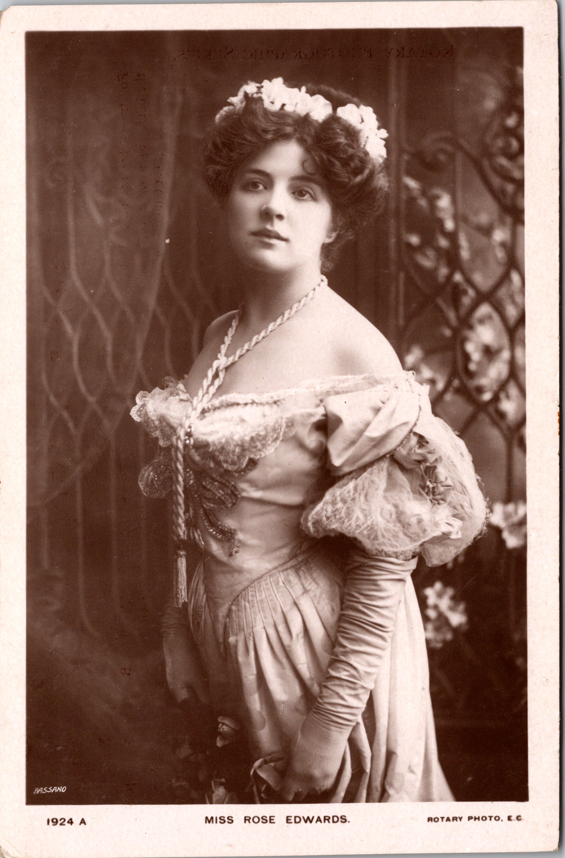 This postcard features a portrait of a pretty young woman named Rose Edwards. I have been unable to learn anything about her. This card is rare. My research could not locate another postcard featuring Miss Edwards. This card was published by Rotary Photo as part of their “Rotary Photographic Series” (No.1924A). Edwards photo portrait was taken by Alexander Bassano (1829-1913),a leading royal and high society photographer in Victorian London. Given the identity of the publisher and photographer, my best hypothesis is that Miss Edwards was a relatively minor actress, dancer, or singer. However, there is a competing theory. Although improbable, the Rose Edwards featured in this postcard portrait, may be female boxer, Mrs. Rose Edwards. The Library of Congress possesses a photograph of a Mrs Rose Edwards fighting Frl. Kussin in a 1912 boxing match. Miss Rose Edwards, seen on this postcard, does not give the appearance of a boxer. In reality, old female boxing photos reveal that many of the woman who fought in boxing contests were quite pretty and relatively slender, They were not “built” like stereotypical boxers. This vintage postcard has some cornerwear and is in overall good condition (see scans).