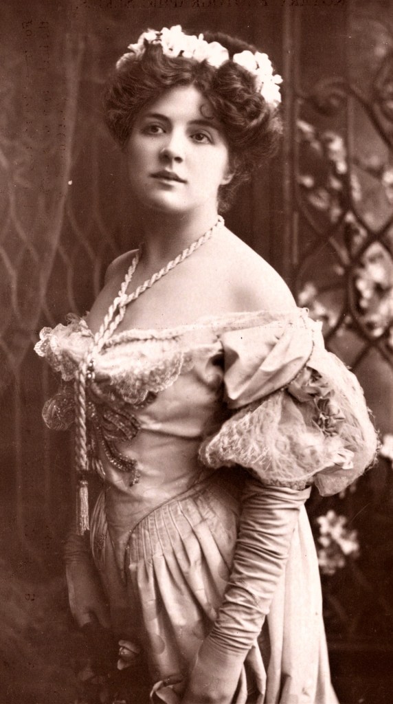 Postcard 2 was photographed by Edouard Stebbing. He was active in Paris between 1890 and 1910. Stebbing taught at a University in Paris and invented the stebbing camera, and was known for his work with emulsions. It is reported that he was friends with the artist Monet. He died in 1914 and his wife (Celestine) died five years earlier. Stebbing was a prolific photographer during the Belle Epoque Paris. He appears to have been an expatriate from England. He published many articles in British Photographic journals. Stebbing photographed many theatrical stars. A frequent publisher of these postcards was Monsieur G.Piprot, of “Etoille” or “Star” publishing in Paris. The “Photographic Times and American Photographer” (1883) cited Stebbing as “one of the bright lights of the French Photographic Society. The card has a 1908 postmark. SOLD