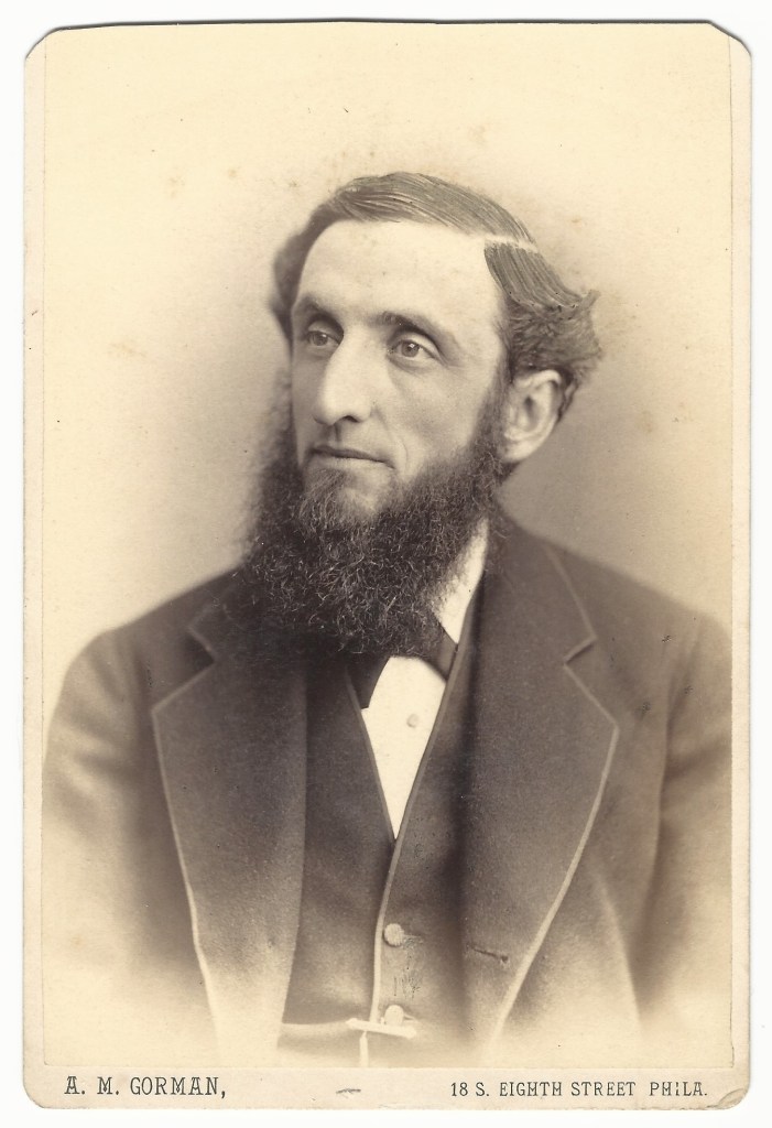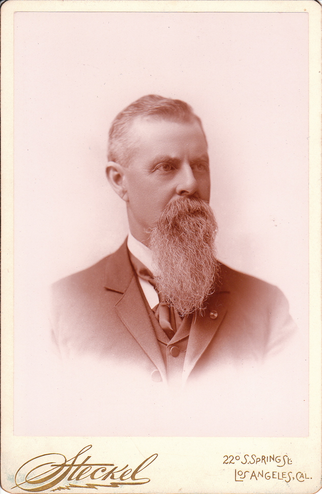 A distinguished looking older gentleman poses for his portrait at the Steckel studio in Los Angeles, California. The subject is very well dressed and has neatly cut hair, a walrus mustache, and a nicely shaped beard. The beard is shaped like the letter “V”. (To view other noteworthy beards, click on the category “Beards (Only the Best). Note that the gentleman is wearing a lapel pin which is probably representing a fraternal organization. George Steckel (1864-1938) was a highly skilled photographer and won many important awards for his work. In the book “Los Angeles from the Mountains to the Sea” (1921), author, John Steven McGroarty, provides some biographical informaion about the photographer. Stecker was born in Allentown, Pennsylvania and dropped out of public schools at age thirteen. He then worked for a photography studio for two years. He moved to Philadelphia and did photography work there. He then returned to Allentown and opened his own studio which was in business for three years. His next stop was Kansas City, where he worked in the Real Estate field until 1888. He then travelled to Los Angeles and opened a studio, partnering with Joseph H. Lamson (see images by Lamson by clicking on category “Photographer: Lamson”). The partnership eroded after two years, and Stecker opened his own studio in Las Angeles. It is interesting to note that posters made from his 1894 photograph of Eugen Sandow (1867-1925), nude, with the exception of strategically placed fig leaf, are available for sale today. Sandow was a Prussian pioneering body-builder who was a celebrity of his era. SOLD