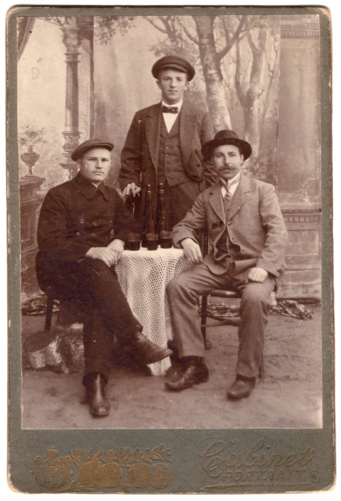 PORTRAIT OF THREE MEN AND THREE BOTTLES OF ALCOHOL