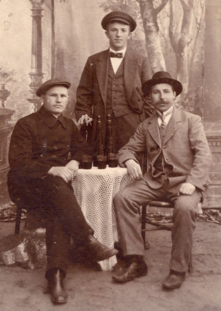 This cabinet card is a portrait of four men sitting around a table drinking beers. The men are wearing dress clothing as they enjoy happy hour at the studio of Axel M. Turnquist, in Eveleth, Minnesota. One of the men is drinking out of a glass, while the other three prefer to imbibe straight out of the bottle. The reverse of the card has a notation indicating that the subjects in the photograph are members of the “Nelson” family. To view other photographs by Turnquist, and learn some biographical facts about him, click on the category “Photographer: Turnquist”.