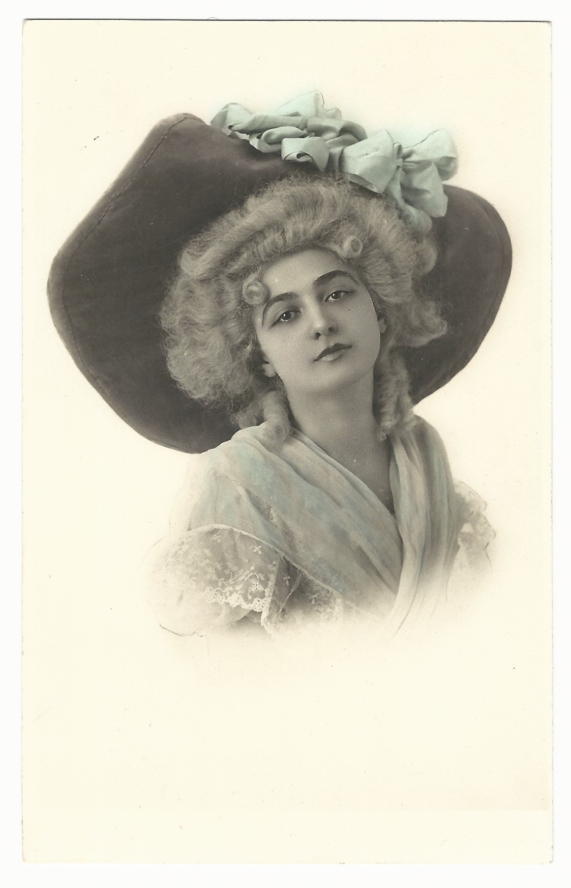 These color tinted vintage real photo postcards feature French actress and singer, Jane Hading (1859-1941). She was born in Marseille, France and was the illegitimate daughter of an actor there at the Theatre du Gymnase. She made her first stage appearance at three years of age. She trained at the local Conservatoire and in 1873 she was hired to perform at a theatre in Algiers. She then was engaged to perform in Cairo, Egypt, where she played coquette, soubrette and ingenue roles. Returning to Marseille, she did stage acting and she sang in operettas. Her first appearance in Paris was in 1879 at the Palais Royal. In 1884, she married playwright and theatre manager, Victor Koning but the pair were divorced within three years. In 1888 and 1893, she toured America. Later, she toured South America with a theater company. In around 1892 she joined the Comedie Francaise. By this time, she was an established star in France, America, and England. She was also considered one of the prettiest actresses of her time.