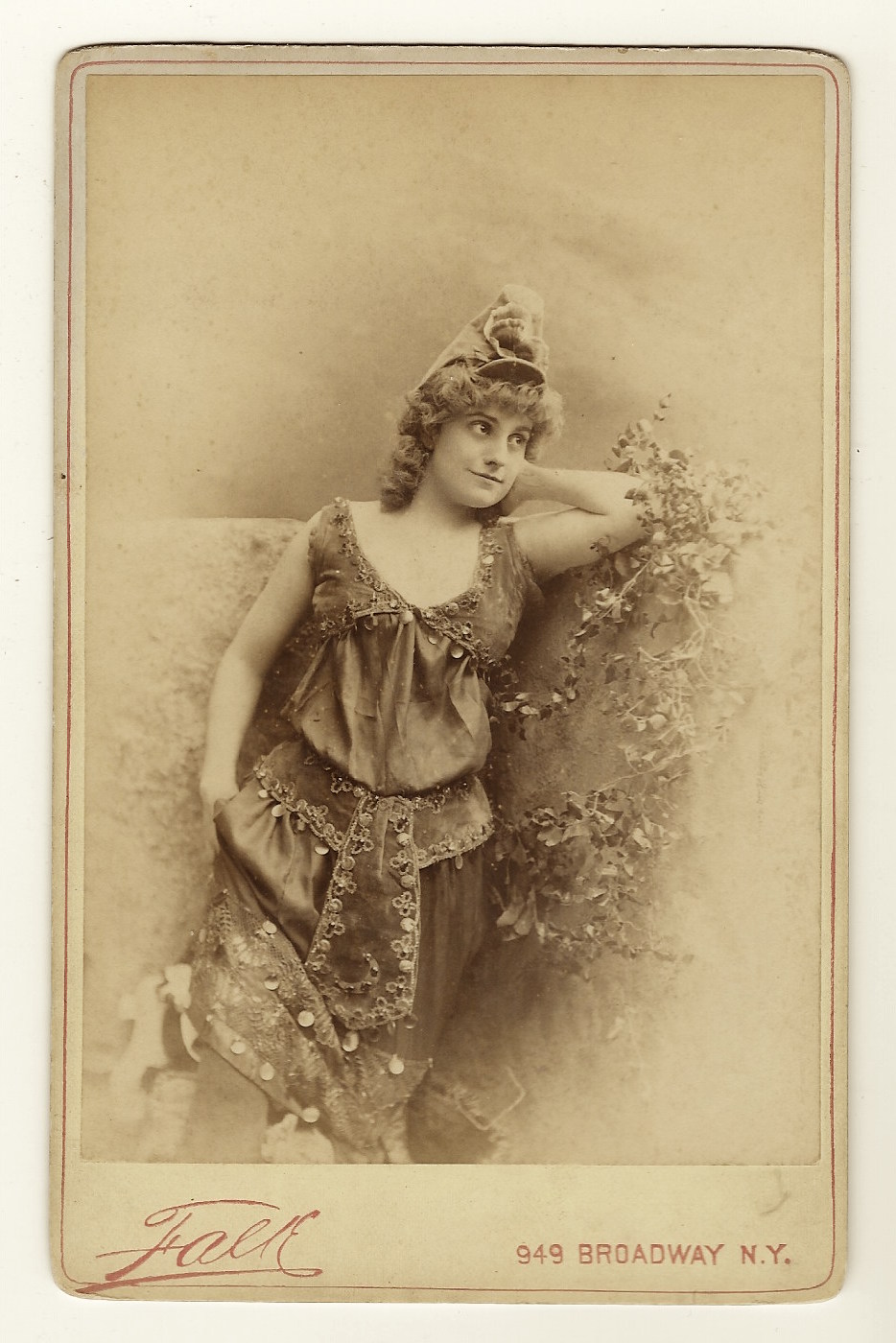 This Newsboy cabinet card features a portrait of actress, Frances Everett. The photograph is number 329 of a series of images published by Newsboy to distribute as a premium with their tobacco products. The photograph was taken by B. J. Falk and has a copyright of 1891. The cabinet card has a stamp from the Theatral (Theatrical?) Photo. Company of New York City. Miss Everett holds a string instrument (mandolin?) and is dressed in a rather risque costume for her era. She is also wearing a great smile. Preliminary research found no biographical information about Miss Everett or the Theatral Photo Company.
