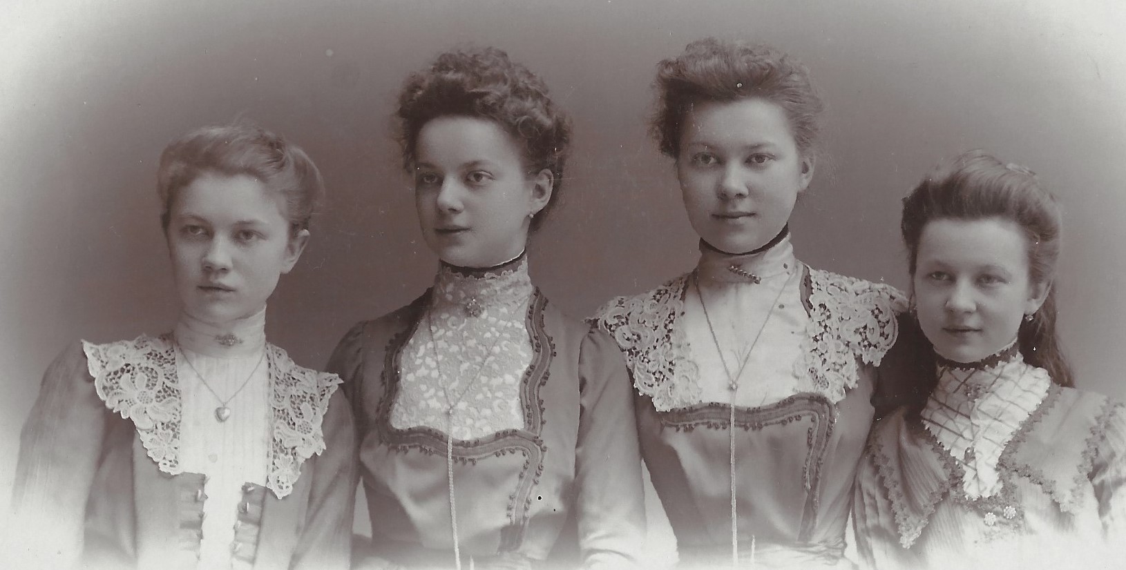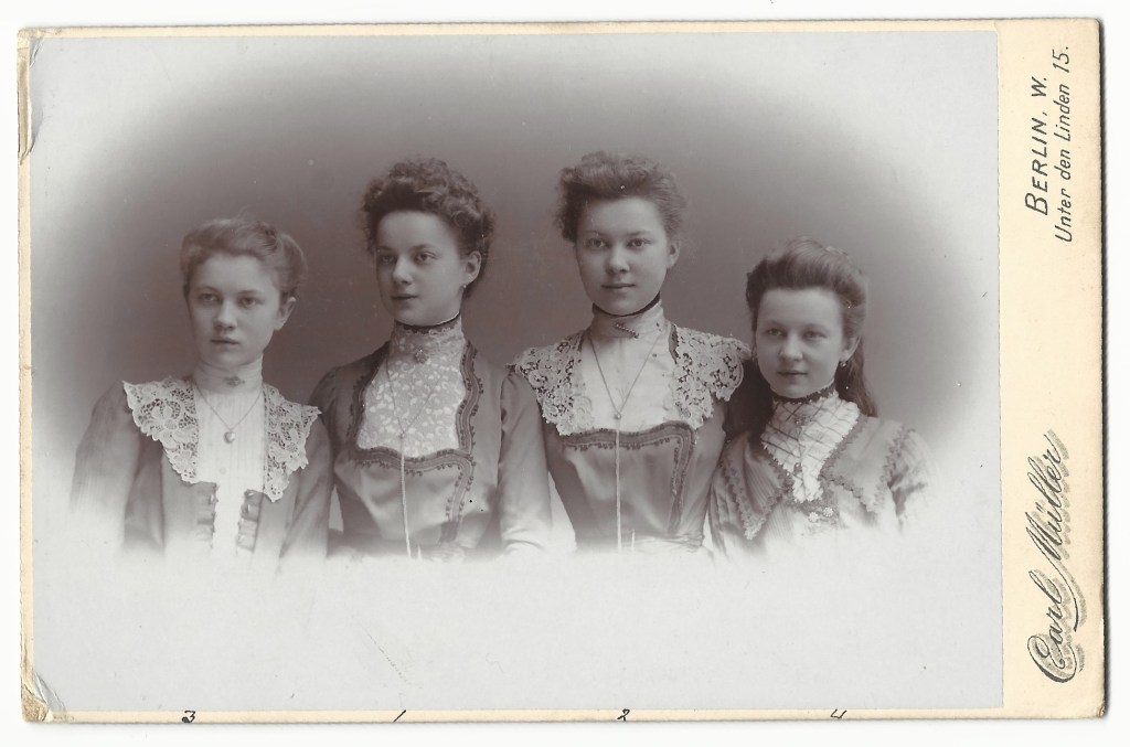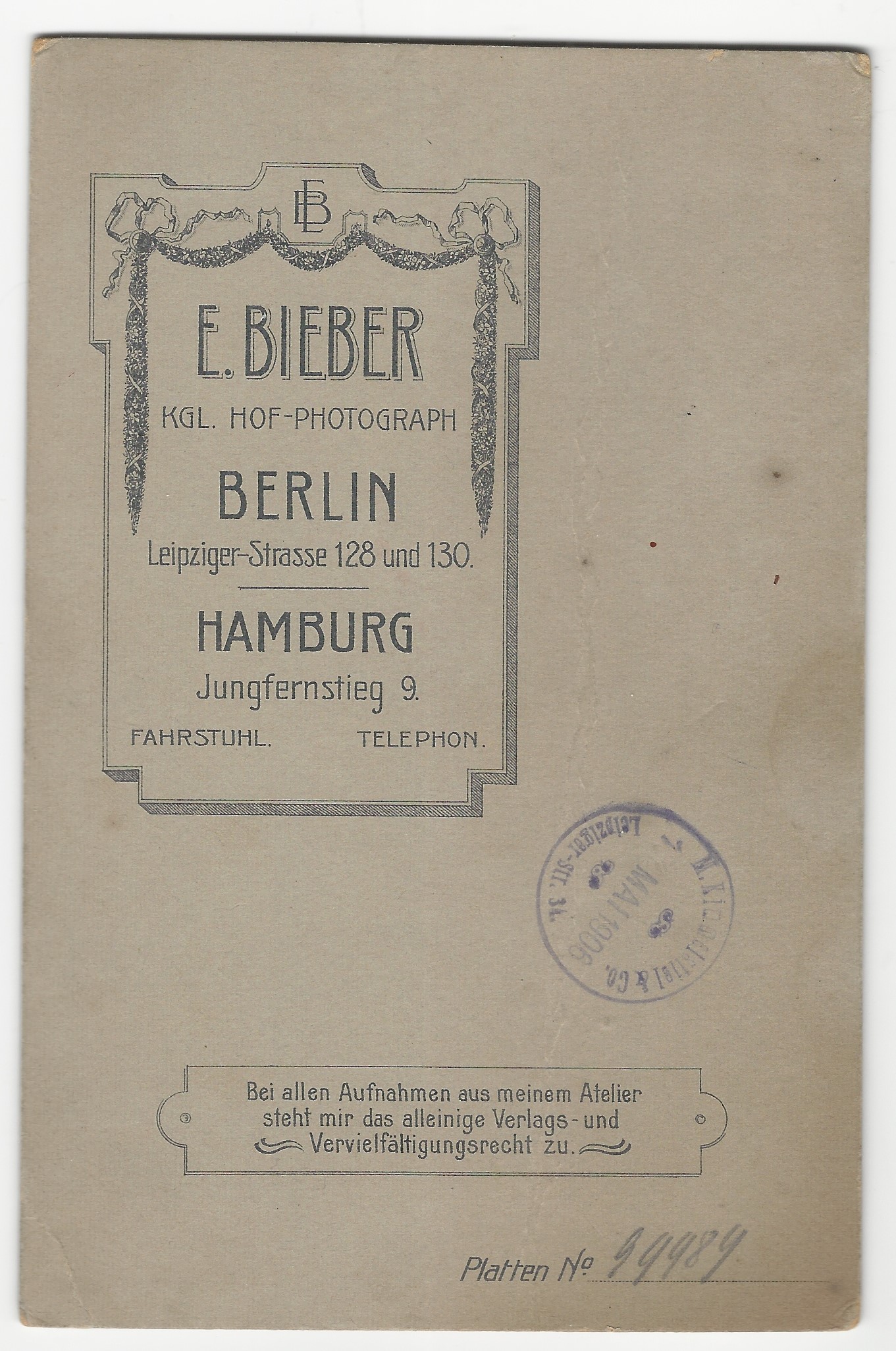 A beautifully dressed young woman and two children pose for a family portrait at the studio of C. Gunteritz, in Berlin, Germany. The young woman is likely the mother of the two children, although it is possible that she could be their older sister. The little girl is holding a basket of flowers and her younger brother has a toy rabbit on his lap. The young woman’s dress is made of material that is not commonly seen in cabinet card photographs. Hopefully, a visitor to the Cabinet Card Gallery will be able to identify the dress’s material. This cabinet card portrait is in very good condition (see scans).