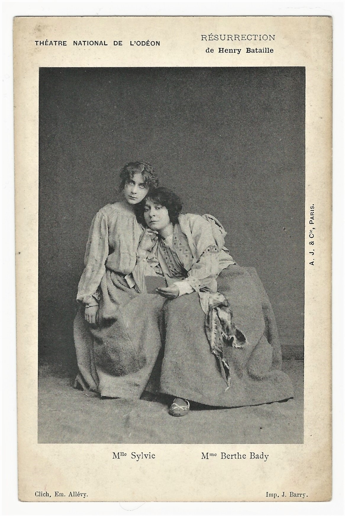 This vintage theater postcard features two actresses appearing in the play, “Resurrection”, by Henry Bataille. The play was adapted from a novel written by Leo Tolstoy. The novel was originally published in 1899. The play was performed at the “Theatre National de L’odeon. The actresses are Mll Sylvie (1883-1970) and Mme Bertha Bady (1872-1921). Here are brief biographical skethches of the actresses. Sylvie was born in Paris, France. Her original name was Louise Pauline Mainguene. Her father was a sailor and her mother was a teacher. She started her professional career in 1903. She appeared in a number of French silent films. She was both a stage and a screen actress. She graduated from the Paris Conservatoire. Her filmography, listed by IMDb, credits her as acting in 54 films between 1912 and 1968. Berthe Bady was born in Belgium but her nationality was French. Berthe Bady attended the Brussels Conservatory and was active on the stage between 1893 and 1913. She was a beautiful actress. Berthe was a companion to both Lugne-Poe and Felix-Henri Bataille. Lugne-Poe was a French actor, theatrical director, and scenic designer. He and Bady were involved in symbolist movement of the arts. Bataille was a French dramatist and poet. A brief explanation of symbolism seems to be merited. In theatre, symbolism is a way to bring a greater meaning to something than is apparent at face value. The use of color, characters, movement, props and costumes are all methods of presenting symbolism. In 1897 Bady was the subject of a portrait by Toulouse Lautrec and her death was the subject of a poem by a leading French poet, Louis Aragon. In addition, playwright Fernand Crommelynck dedicated a play to her. Wikipedia credits her with sixteen “notable” play appearances between 1893 and 1913. She appeared in Ibsen’s “The Master Builder” on an international tour. The tour took her to London, Brussels, Amsterdam, Milan, and additional cities. In 1918 she appeared in her one and only film, “Ecce Homo”. The photo of Berthe and Sylvie was taken by Emile Allevy, a Paris photographer. The postcard was published by A.J.C. (Arthur John Carter) of Eastbourne, England. This postcard was likely published around 1902 since that is when Bady played in the play at the Theatre National de L’odeon. This vintage postcard is in good condition (see scans).