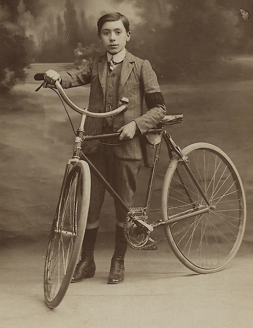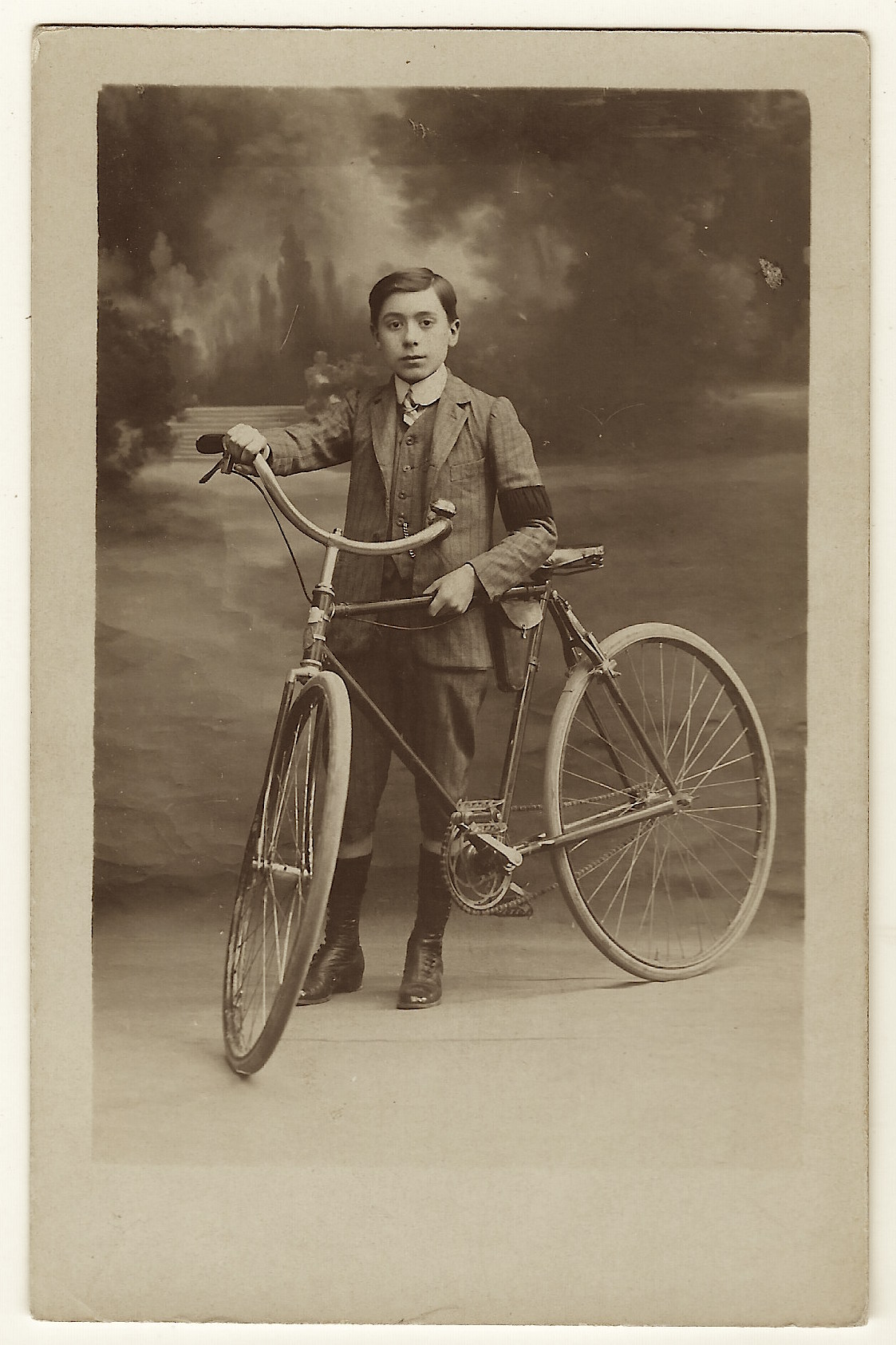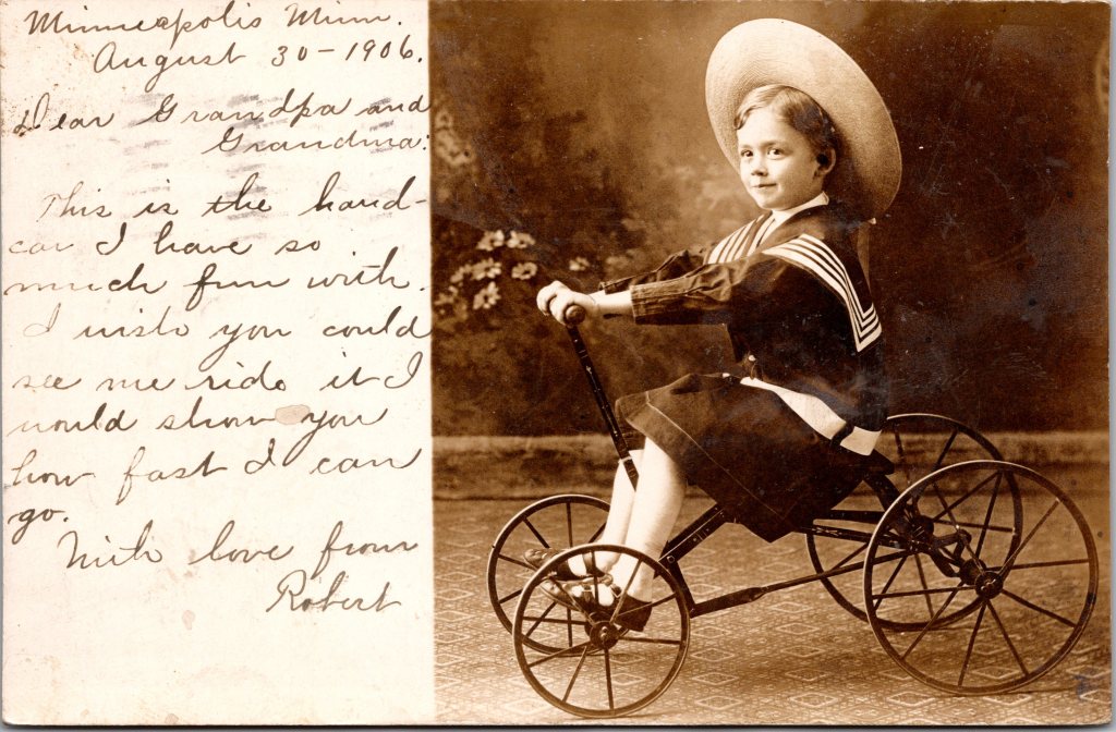 This vintage real photo postcard features a young woman and her bicycle. It is a studio photograph which explains why the woman and her bike are inside the house. (SOLD)