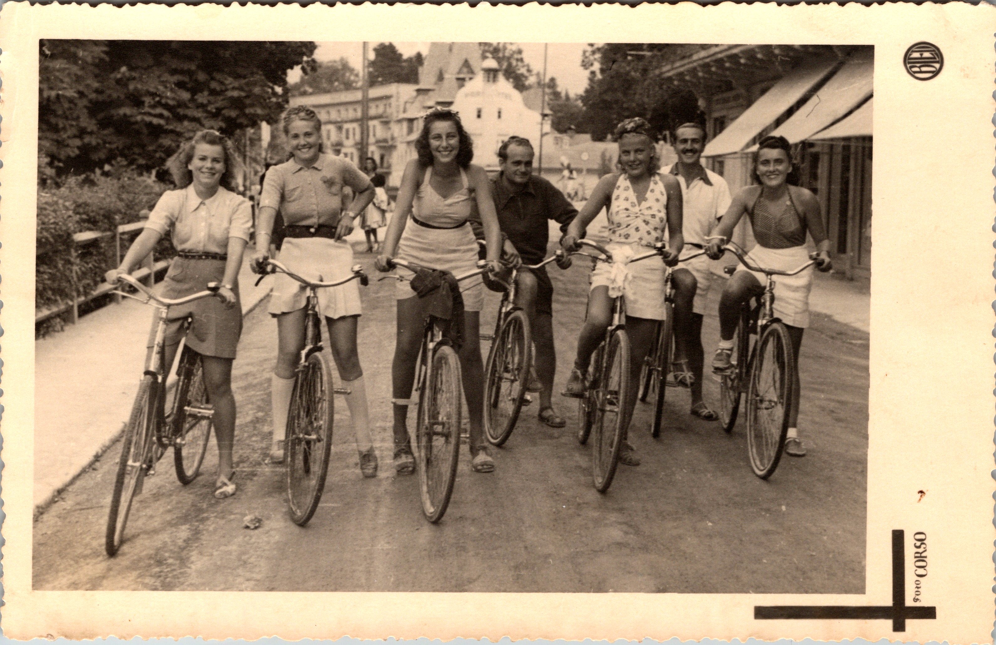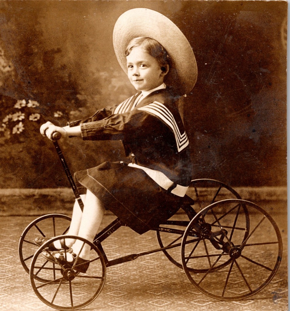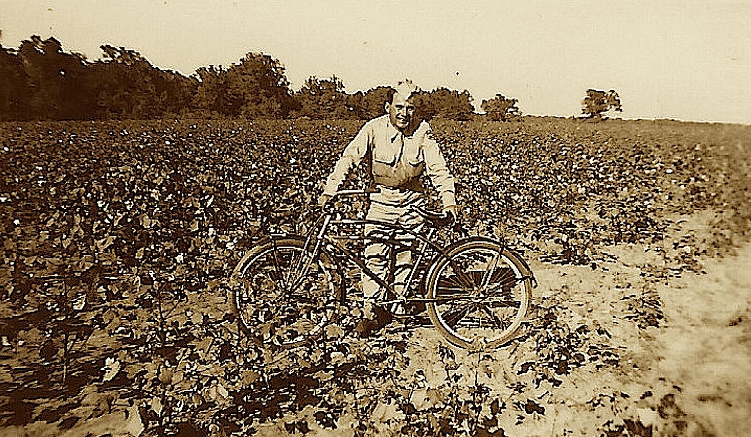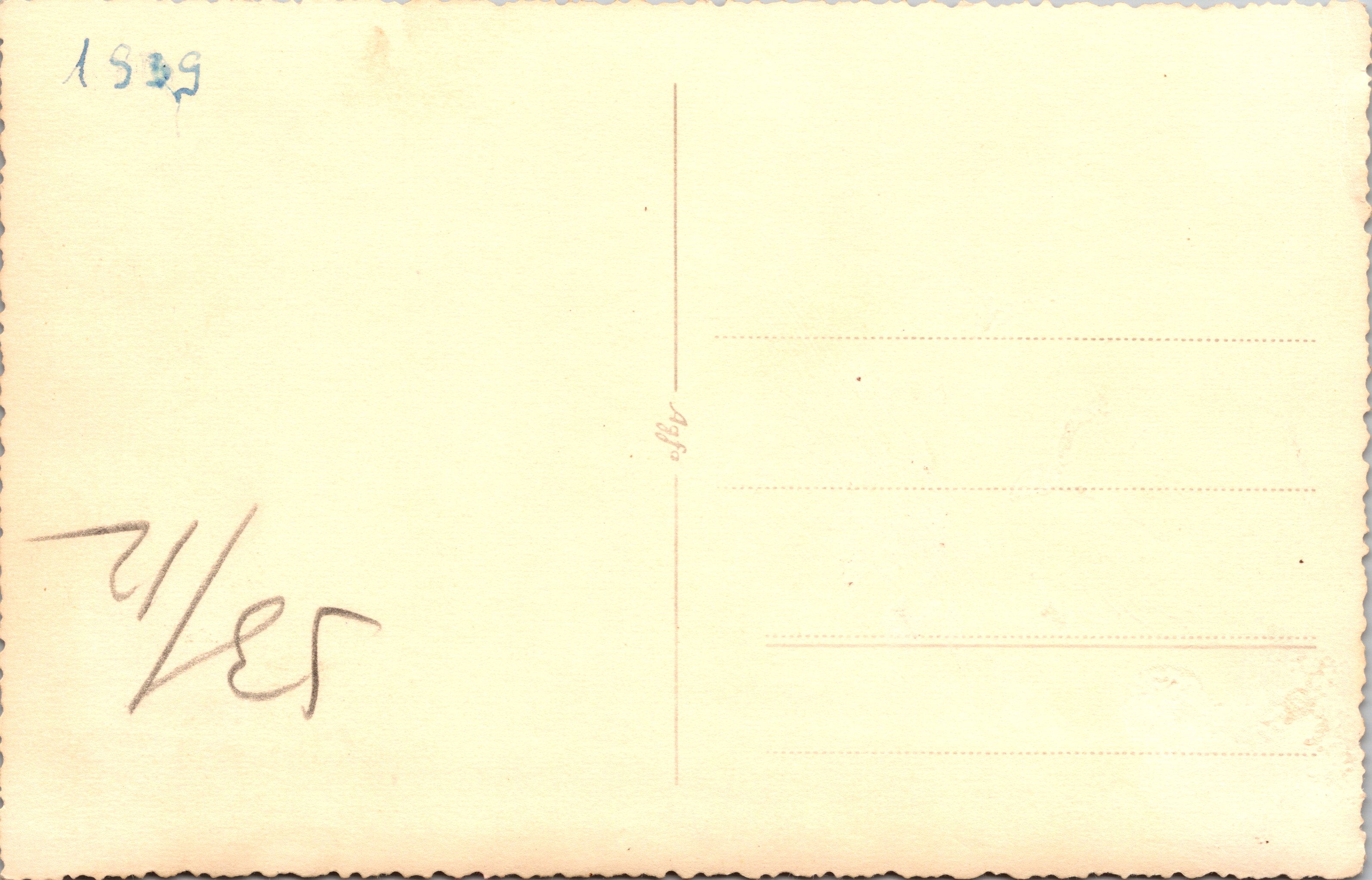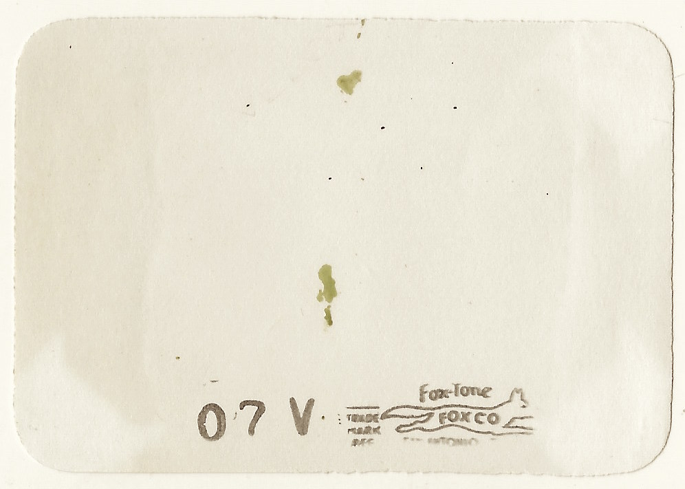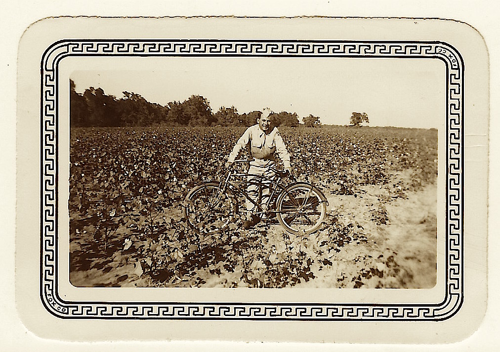 This photograph features a uniformed soldier standing in a farmer’s field and posing behind his bicycle. This photo was found in a shop in the Texas Hill Country. It was part of a group of Foxco images from the mid 1940’s. This photograph was developed by Foxco of San Antonio. The company has an interesting history. The Fox Photo Studio was opened by Arthur C. Fox in 1906 in San Antonio, Texas. Fox sold the studio for seven hundred dollars to Carl D. Newton in 1909. Newton was a clever entrepreneur. One of his gimmicks was to offer a free camera to anyone buying three rolls of film and prepaying developing and printing fees. His successor to the business was Carl D Newton II. By the mid 1930’s Fox advertised itself as the world’s largest Kodak finishers. Their processing plant was in operation around the clock. The company expanded and opened facilities in Dallas, Houston, Louisiana and Oklahoma. The company grew and grew and ultimately reached 12,000 dealers nationwide. In 1986, the company was sold to Kodak. Carl D Newton III kept the retail division of the business, calling it Fox Photo. Later, the business changed hands a number of times until it faded into history. The photo measures about 3 1/4″ x 2 1/4″. (SOLD)
