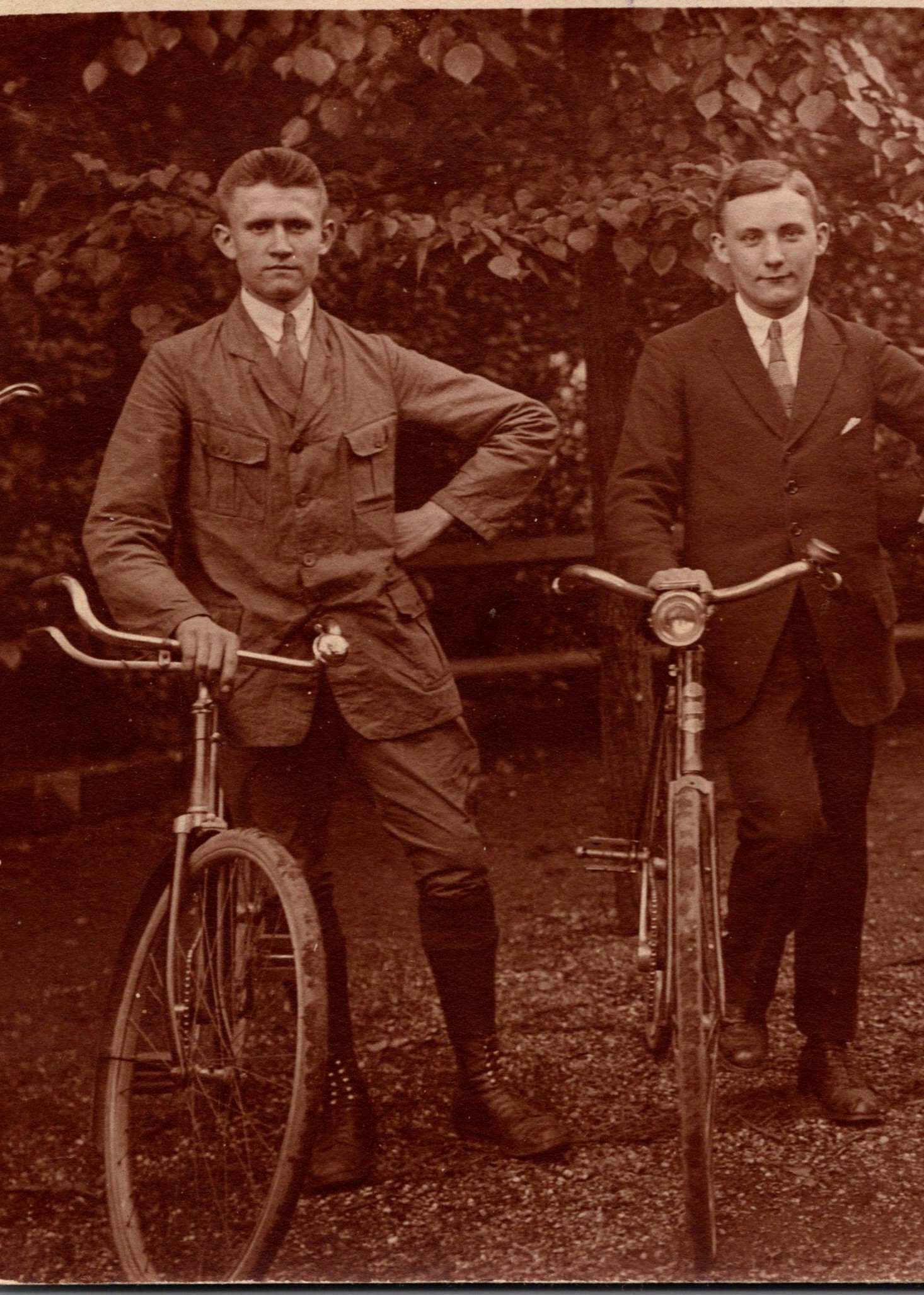 This Cabinet Card features two young woman and their bicycles. Magnification reveals that the bicycles have bells on the handle bars. The woman are wearing caps which brings up the issue of whether this is an occupational photograph. For example, were these women messengers or some other bicycle related employment. The woman on the left is wearing a dress which would make bicycling very difficult, so another possibility is that the caps and the bikes are just props from the photographic studio. The reverse of the card has an inscription that indicates that the woman under the “x” (the woman on the left), is named Miss H. Pleiss. Also in the inscription appears to be the word “Butte’. It is very possible that this cabinet card is from Butte, Montana. There is no evidence concerning the identity of the photographer. Note crease (not rip) near bottom left corner. This photograph is in Fair Condition. (see scans).