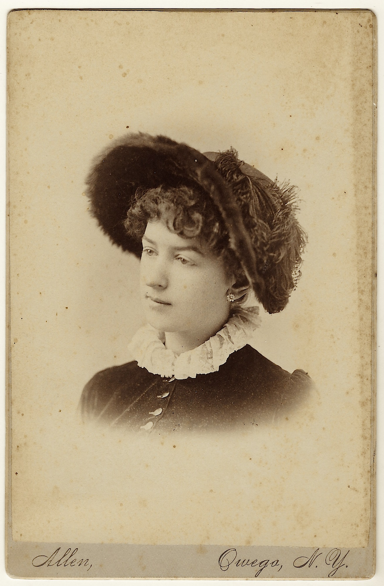 This cabinet card portrait features a pretty young woman wearing an interesting hat. I believe that it is a fur hat. Feathers on the hat as well as its shape make it quite stylish. The woman appears to be in her teenage years. The photographer of this photograph is the Allen Studio in Owego, New York. The town of Owego is located in south central New York. It is on the Susquehanna River. It is about 23 miles from Binghamton, New York. This cabinet card is in good condition (see scans).