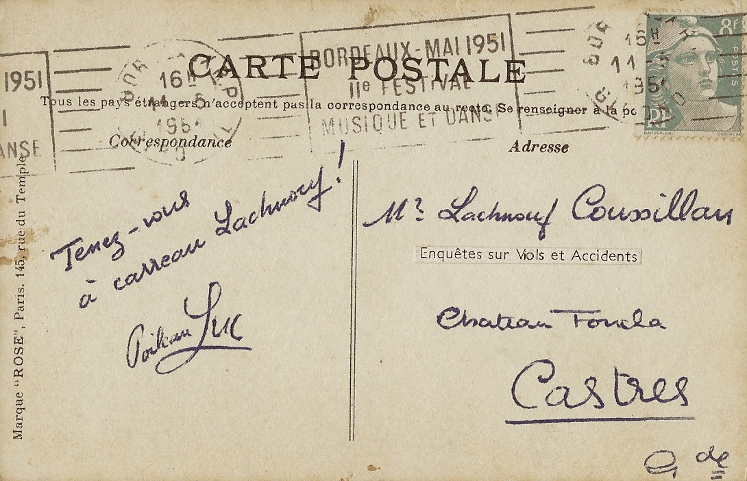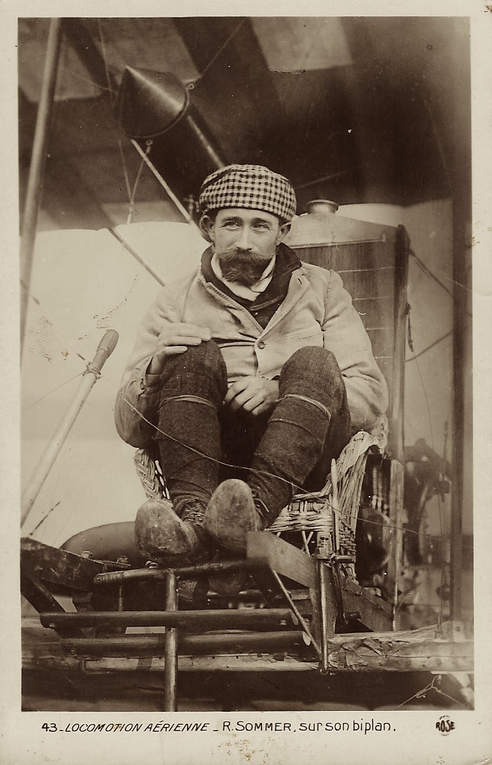This vintage real photo postcard features a portrait of French aviator Roger Somner (1877-1965) sitting in the pilot seat of his 1910 biplane. Somner was an aviation pioneer. The Washington Herald (1909) reported that he broke a world record in a Farman Biplane by flying one hour and fifty minutes at the height of 80 feet. This was a record due to the length of time logged in the air. The Oregon News (1909) described an international aviation contest involving at least five nations competing for about 401,000 dollars worth of prizes. Somner was representing France while the American competitor was Glenn Curtiss (another celebrated aviation pioneer). The Lewiston Evening Journal (1910) reported that Somner ad established a new world record by piloting a plane with three passengers for a total of five minutes. Somner was clearly a brave man. This vintage postcard has a postmark from the French city of Bordeaux in 1951.