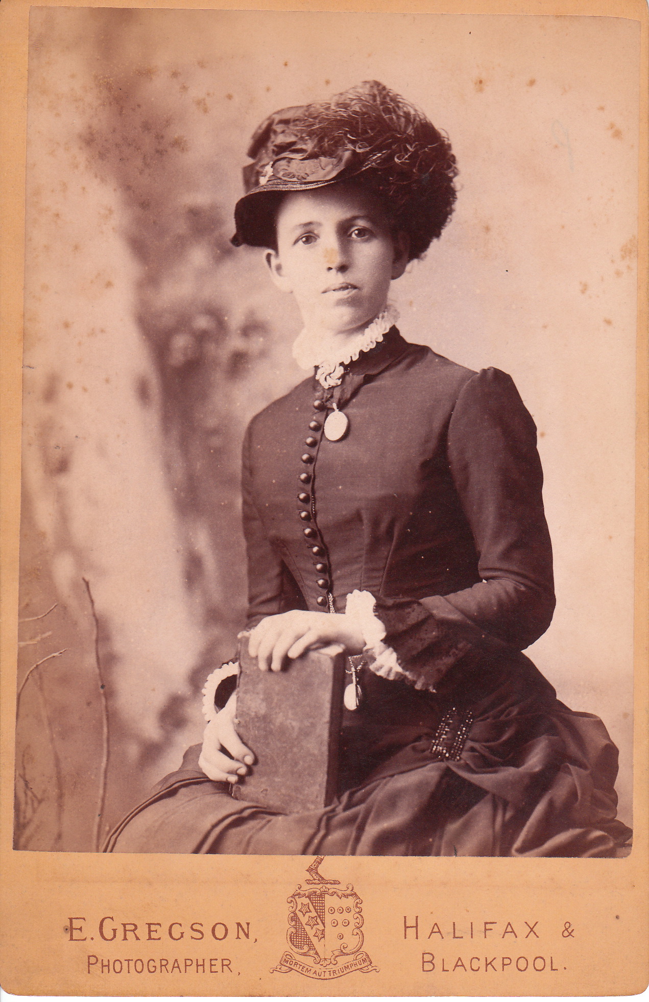 This cabinet card of a man and two women posing aboard a ship, was photographed by D. Mitchell of Blackpool, Great Britain. The photographer, whose studio was located near a pier in the seaside city of Blackpool, utilized a relevant nautical theme. The backdrop is fantastic and the hanging rope held by the gentleman, and the ropes in front of the ladies, are a “great touch”. This is an unusual and fine use of background scenery and props. The South Pier was originally named the Victoria Pier. The pier opened in 1893 and served vacation travelers to Blackpool. The subjects of this cabinet card image are likely tourists on holiday. Note the fantastic artwork on the reverse of the card. Wow! This portrait cabinet card has good clarity and is in very good condition (see scans).
