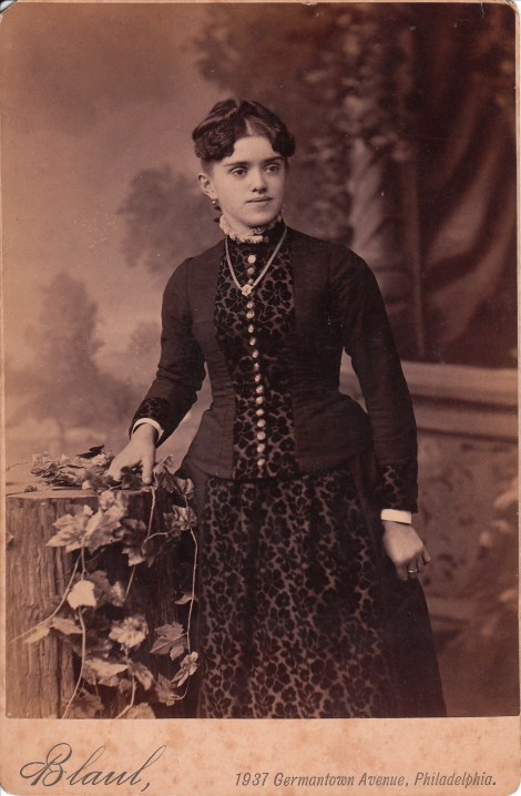 A young woman poses for her portrait in the studio of Louis Blaul located in Philadelphia, Pennsylvania. The bejeweled woman is very attractive and dressed beautifully. She has accessorized herself with a necklace, ring and earrings. To view other photographs by Blaul, and to learn more about him, click on the category “Photographer: Blaul”.