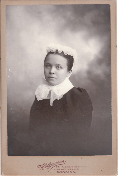 A young woman poses wearing her bonnet at the studio of Holgenson, in Chicago, Illinois. The photograph raises the question of whether the bonnet is simply meant to be fashionable, or does the bonnet indicate that she is a member of a certain ethnic or religious groups. Please leave a comment with any hypotheses about this question. (SOLD)