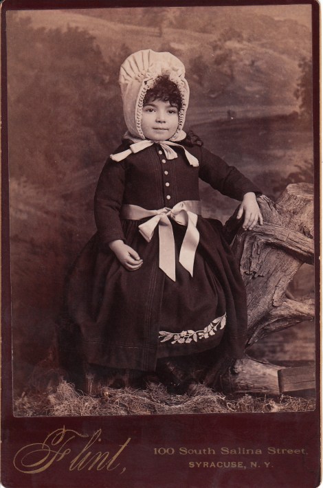 This cabinet card features an adorable little girl bundled up in a heavy dress and wearing a bonnet over her dark curly hair. The ribbons she is wearing makes her appear to be wrapped like a gift. She looks well outfitted for an upstate New York winter. The photographer is F. C. Flint of Syracuse, New York. SOLD