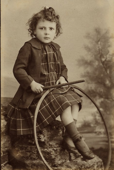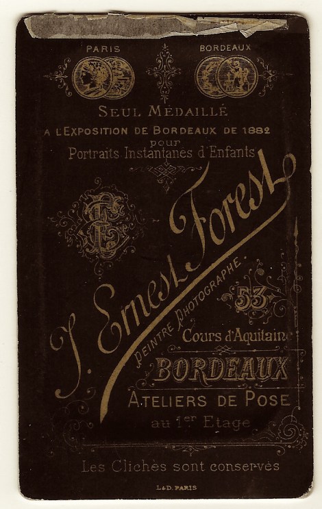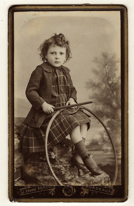 This carte de visite portrait features a young girl wearing a plaid dress and holding a hoop and stick toy. The photographer of this photo is J. Ernest Forest and he operated a studio in Bordeaux, France. Advertising on the reverse of the cdv indicates that the studio won prizes at exhibitions in Bordeaux and Paris.This photograph is in good condition (see scans). A look at the top of the backside of the cdv reveals that this photo is likely a former resident of a photo album or picture frame. (SOLD)