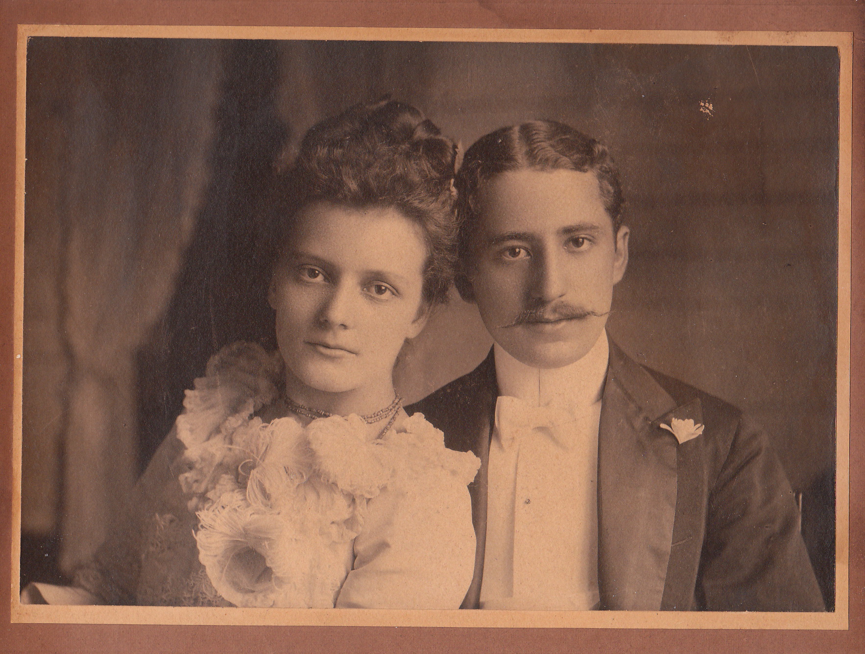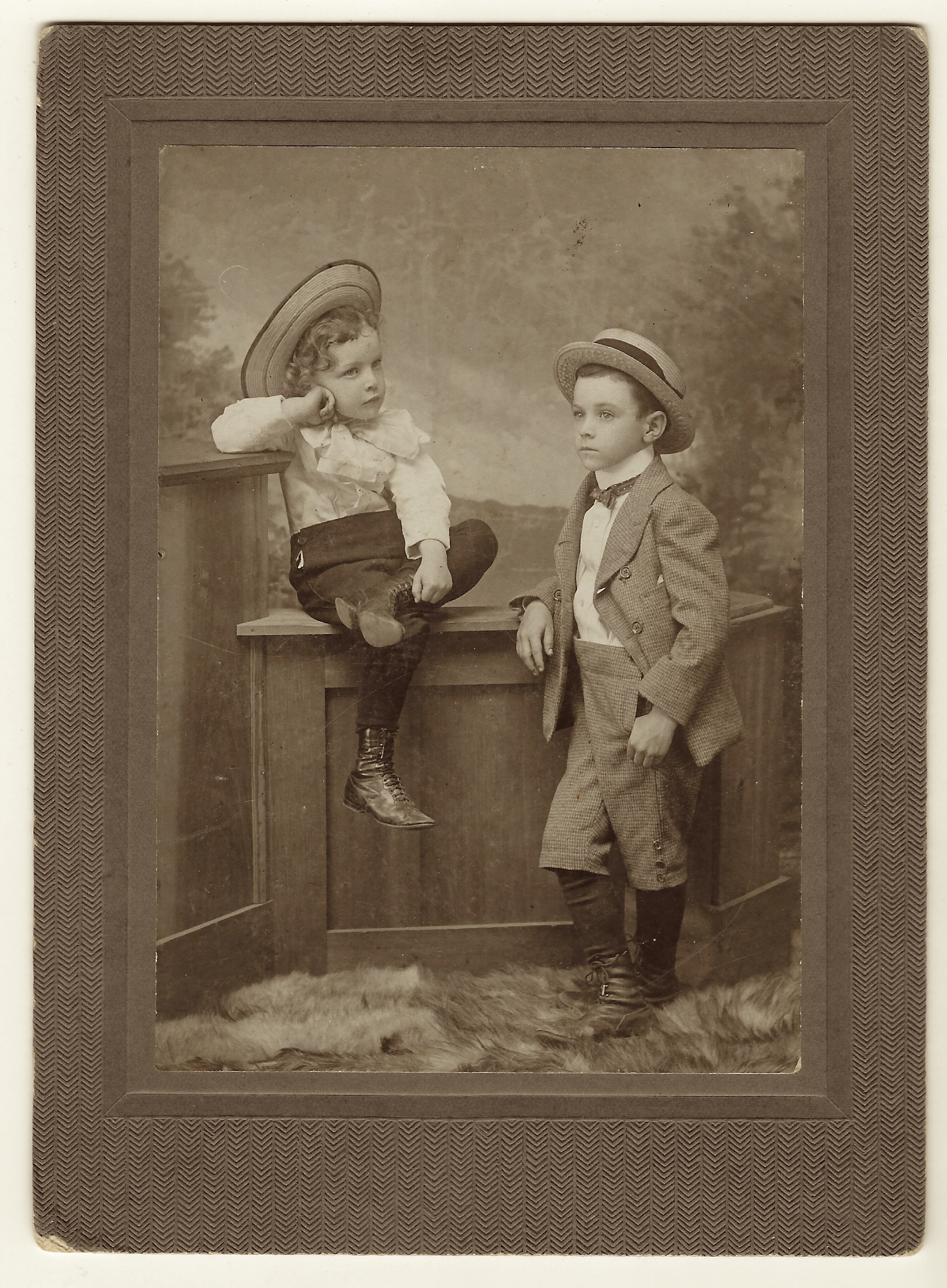 This photograph is a portrait of a spectacular and dashing couple. The gentleman is wearing a tuxedo with a white bow tie and a corsage. He has a terrific handlebar mustache. The lady is wearing a dress with feathers, a corsage, and a necklace. This pair certainly make a beautiful couple. An inscription on the reverse of the photograph states “To Papa” and is signed “Wm. M….”. Unfortunately, a former owner of this image trimmed the photograph to fit it into a picture frame and the debris included the signer’s last name. The photographer’s name and location was also lost in the scissor work. The photo measures about 6″ x 4 7/8″. Overall, this vintage photograph is in good condition (see scans).