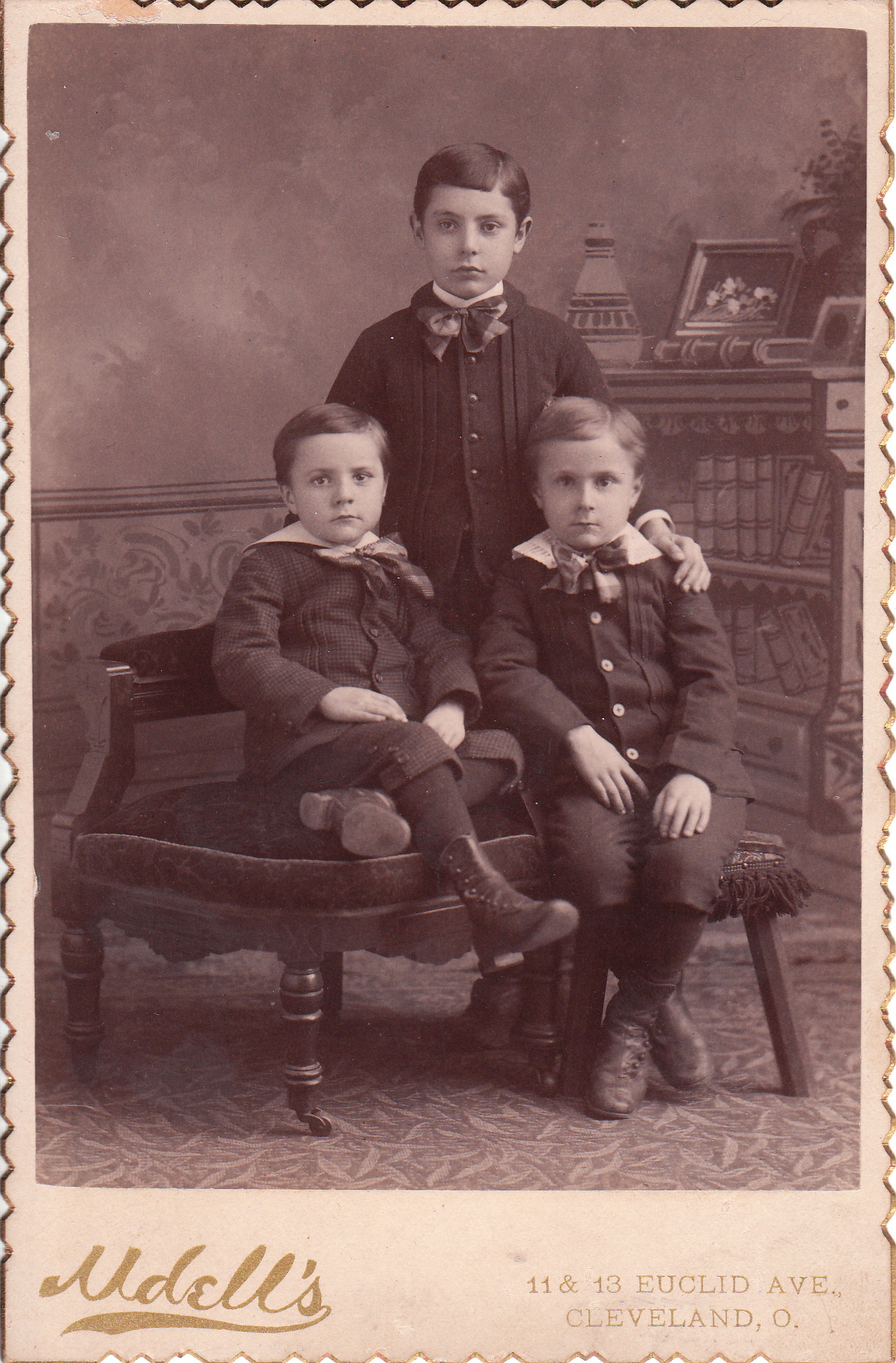 Three young brothers pose for their portrait at M. M. Udell’s studio in Cleveland, Ohio. The boys are wearing suits with short pants and high shoes as well as bow ties. The oldest brother appears quite protective as he poses with his arms around his two young siblings.