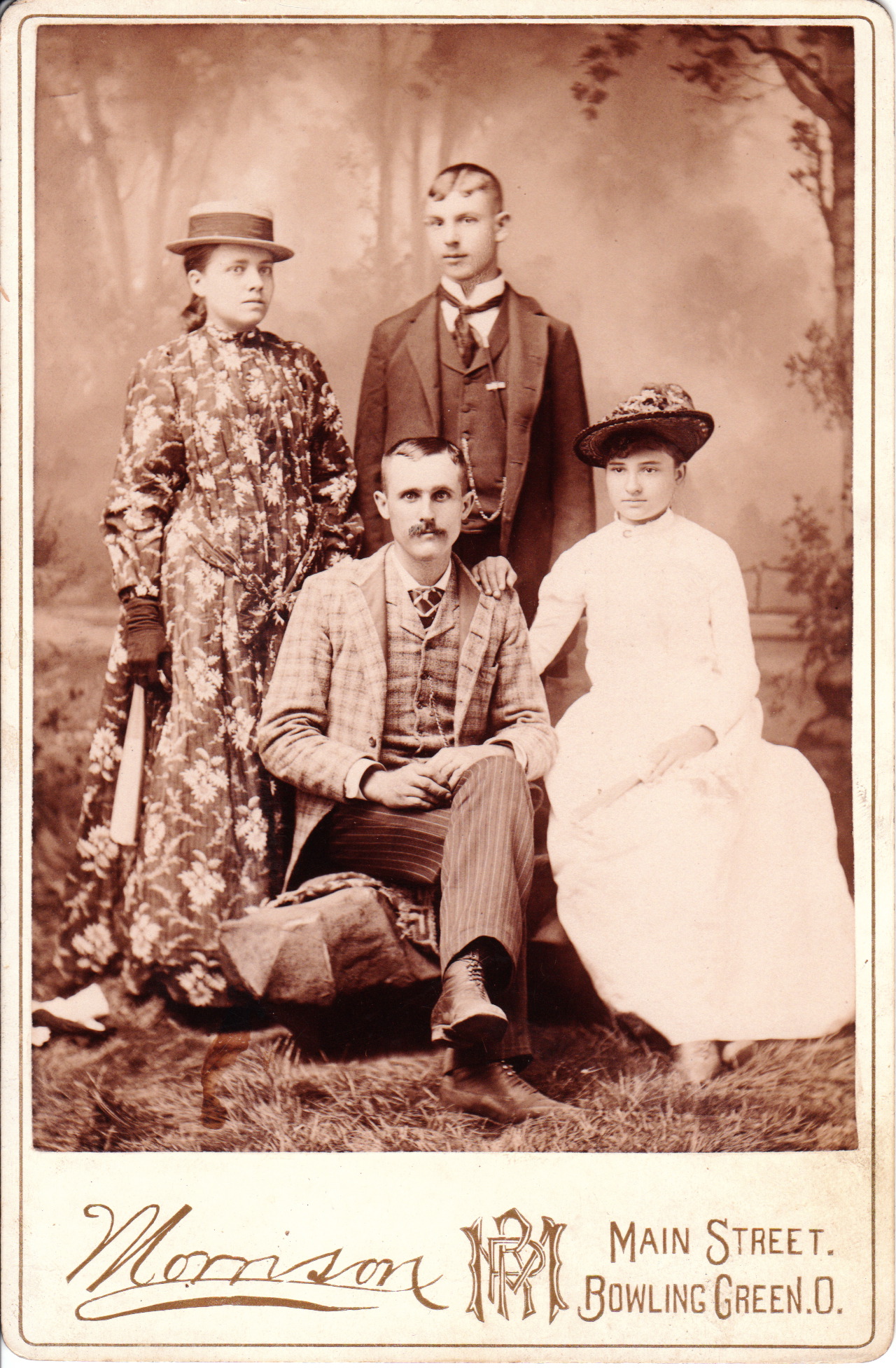 Two sportily dressed couples pose for their portrait at the Morrison studio in Bowling Green, Ohio. To learn more about Robert Prescott Morrison and to view more of his photographs, click on the category “Photographer: Morrison (Bowling Green). The couples are dressed as if they are about to embark on an outside adventure. The standing woman is holding a fan. The standing gentleman has something that appears to be pinned to his vest. Perhaps a visitor to the cabinet card gallery can identify the mystery object. Guesses are welcome so please feel free to leave a comment with your hypotheses.