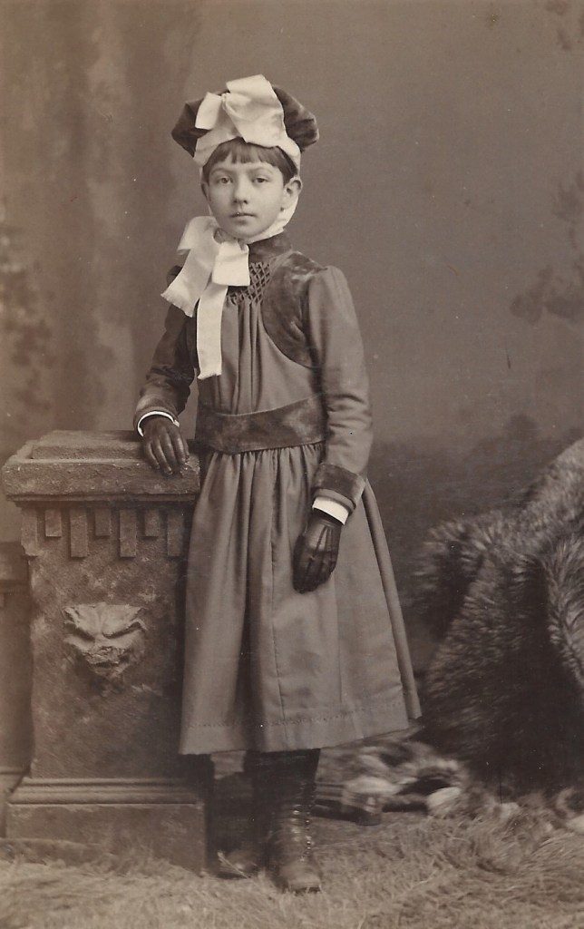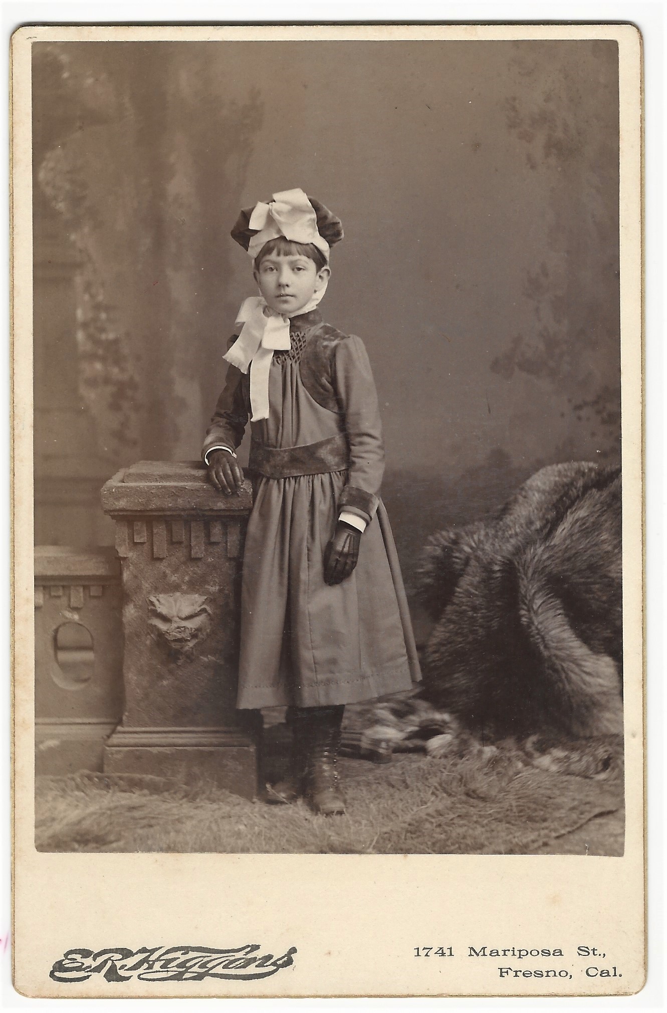 The young girl seen in this cabinet card portrait is quite the fashionista. She is dressed to the max. She likely is a member of a wealthy family. Note her leather gloves and her complex bandage-like hair bow. The photographer of this lovely image is Edgerton Reyerson Higgins (1845-1911) of Fresno, California. Higgins was born in Canada. His mother was Canadian and his father was from Connecticut. He attended high school and Business College in San Francisco, California. He helped out at the photographic gallery of his brother, Thomas J. Higgins while attending school. Higgins worked as a photographer in a number of California towns, including Sacromento, Snelling, Stockton, Merced, Hanford, and Fresno. He worked for at least two well known photographic studios, one of which is represented in the Cabinet Card Gallery collection; Bradley and Rulofson. The second famous photography studio was Thomas Houseworth & Company. Click on the category Photographer: Bradley & Rulofson” to view their photographs. While working in Snelling, Higgins was quoted as saying he took “pretty pictures, even of ugly people”. This cabinet card is from Fresno and it appears that he worked there at two different times. He was there temporarily in 1879. This cabinet card was published during his second stint, which began in 1887. Higgins did much to help his community. In 1889 he was one of the principal founders of the Fresno Volunteer Fire Department, and from about 1889 until the early 1890’s, he served as chief of the department. In 1898 he renamed his gallery the “Rembrandt Studio” and a year later, entered a partnership with a photographer named Howland. The California Historical Society has a small collection of Higgins’s photographs. This cabinet card portrait has a name penciled on it’s reverse. I was unable to decipher the name. (SOLD)
