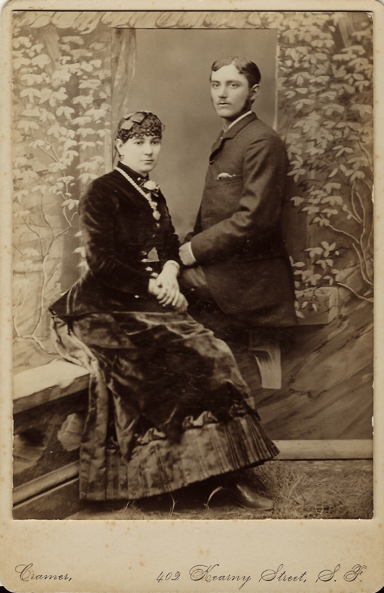 This cabinet card portrait features a lovely young couple posed for their portrait at Cramer’s California Gallery in San Francisco. The reverse of the photograph has an inscription with the name “James Piggott and wife”. Preliminary research identifies this couple as James K Piggott and his wife Mary A. Piggott. Ironically, the 1940 US census indicates that James Piggott owned a photography studio. The business was managed by his son, Harold B. Piggott. The photographer of this cabinet card was Charles Lake Cramer (1835-1911). In his early career he operated photography studios in the California cities of Santa Barbara (1858), San Andreas (1858), and Suisun City (1860). Cramer ran a humorous ad in 1858 that stated “Good pictures made from hard looking subjects”. In 1863, Cramer worked for photographers Bradley & Rulofson (featured prominently in the Cabinet Card Gallery). Cramer ran his own photographic studio in San Francisco between 1863 and 1906. His studio was called the “California Gallery” during the 1870’s and 1880’s which indicates that this photograph was produced during one of those decades (Most probably the 1880’s).