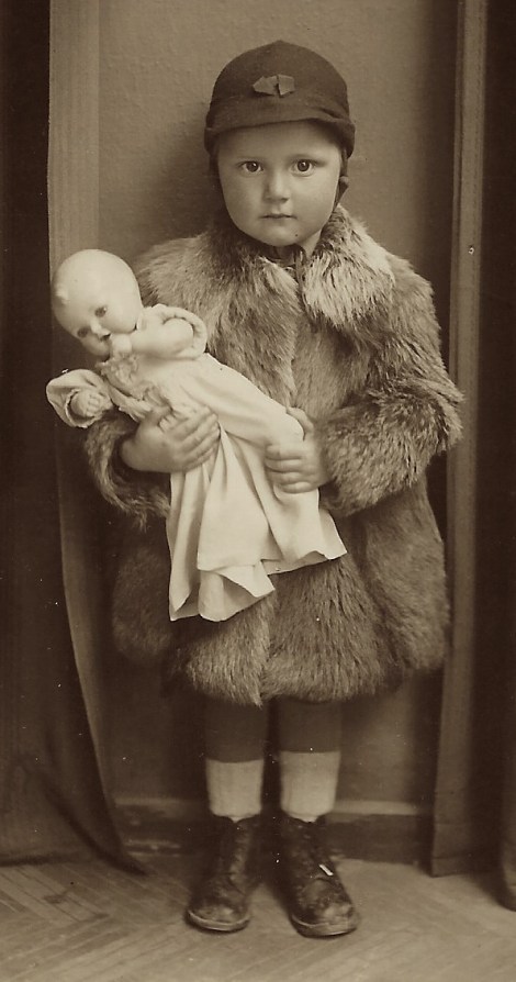 This vintage real photo postcard features an adorable wide-eyed little girl dressed in winter clothing. She is wearing a fur coat and a winter hat. The girl is holding a doll. This photograph was taken by Ferdinand Ertl and the postcard was published by Bradux (c.1930’s). The card is part of a series (86539). Ertl’s studio was located in the Tamsweg-Lungau region of Austria. SOLD
