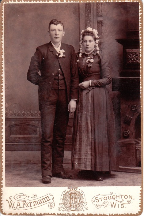 A wedding couple poses for this cabinet card photograph by W. A. Fermann of Stoughton, Wisconsin. This image shows the bride wearing a dark dress, which was not out of the ordinary for the time period of the photograph. The couple is well-flowered for their special day.