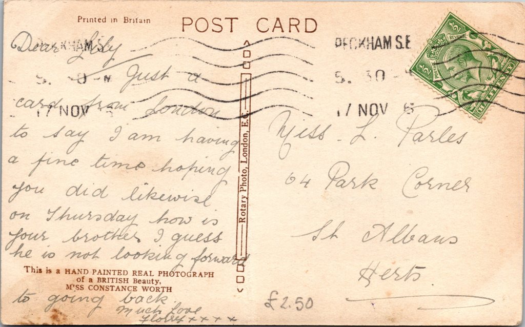 This vintage real photo postcard features “British Beauty”, Constance Worth (1892-1973). The IMDb reports in her filmography that she has nine credits for silent films between 1919 and 1922. This card was published by Rotary Photo and is postmarked in 1916. (SOLD)
