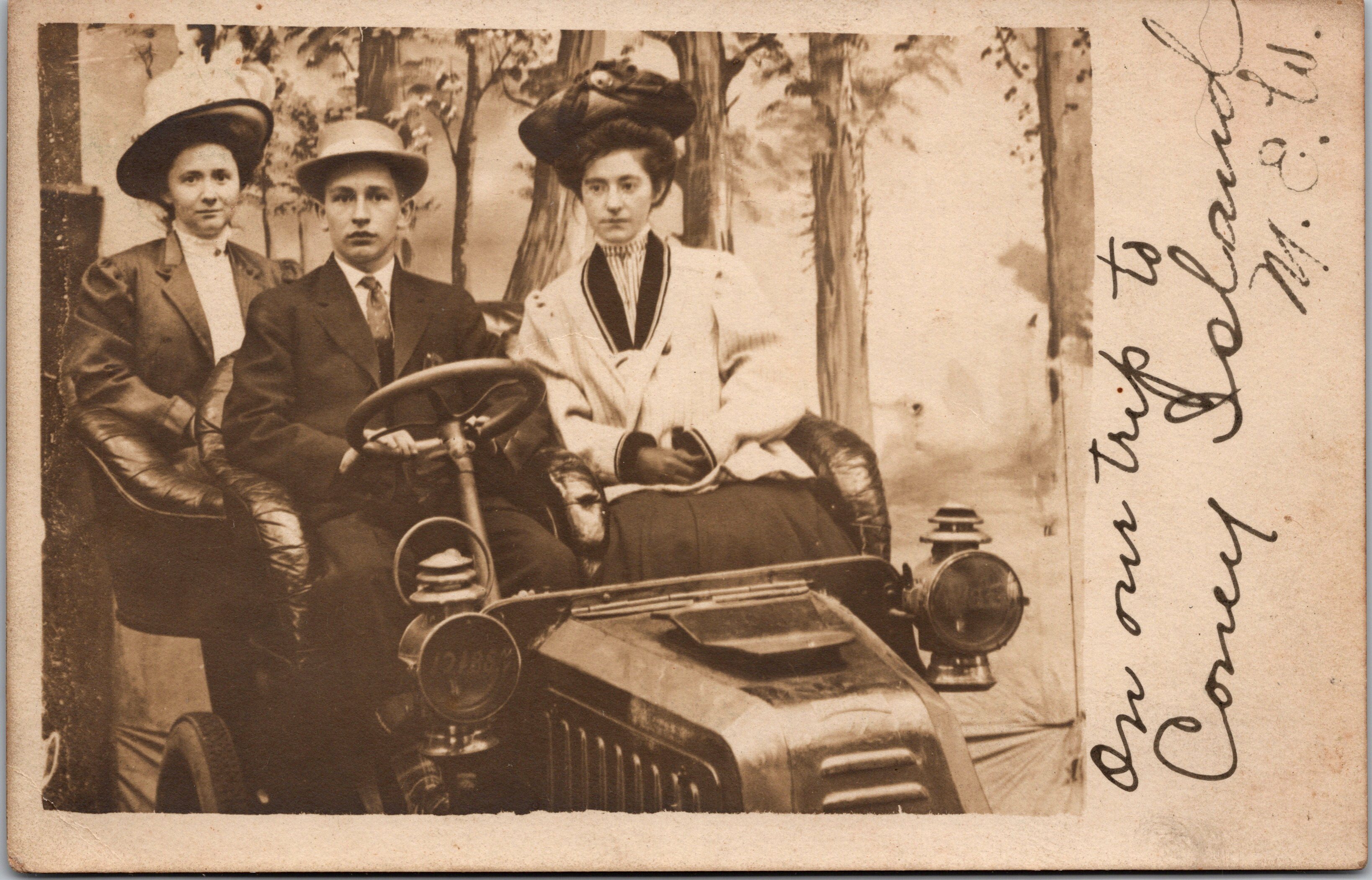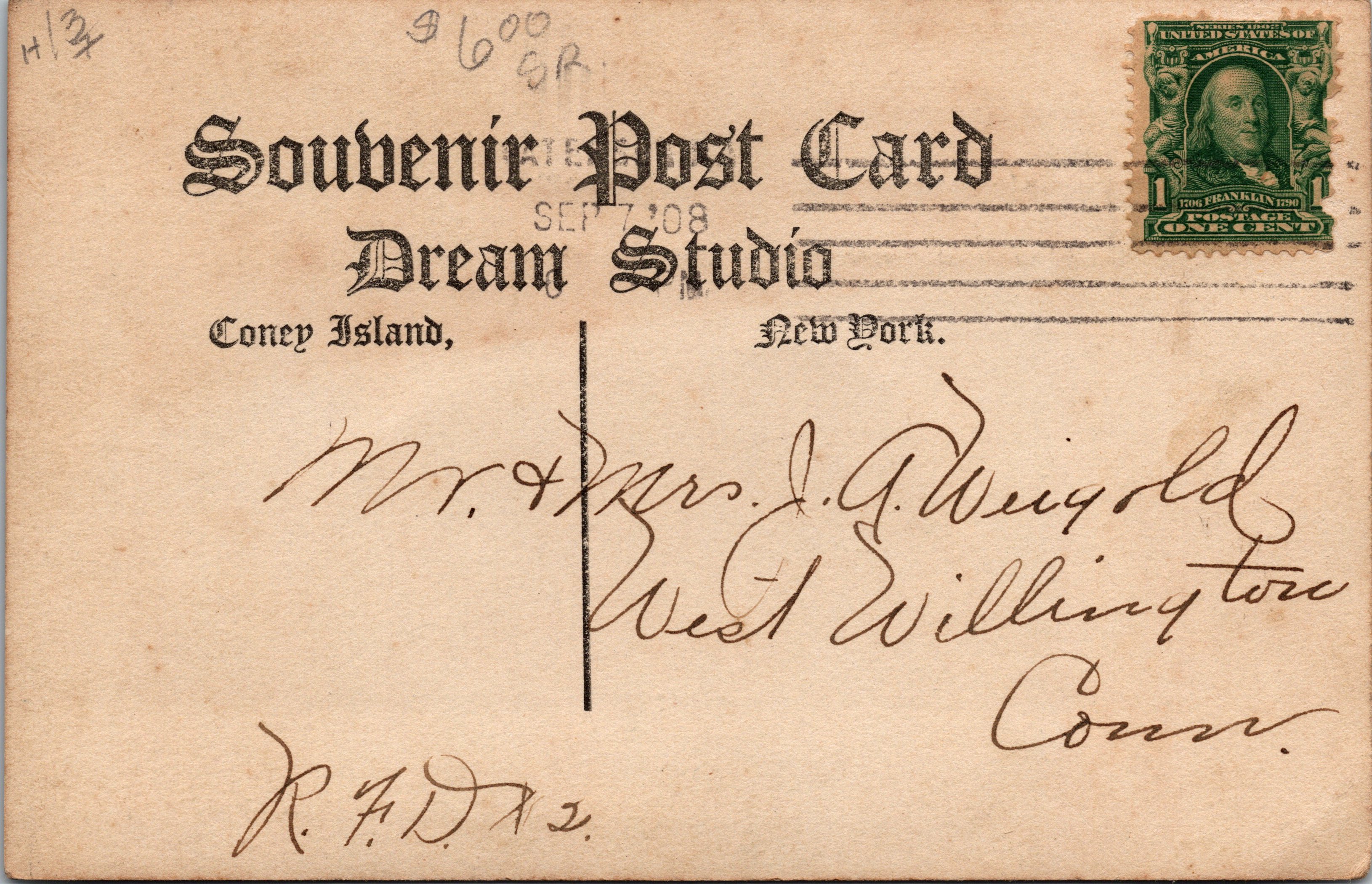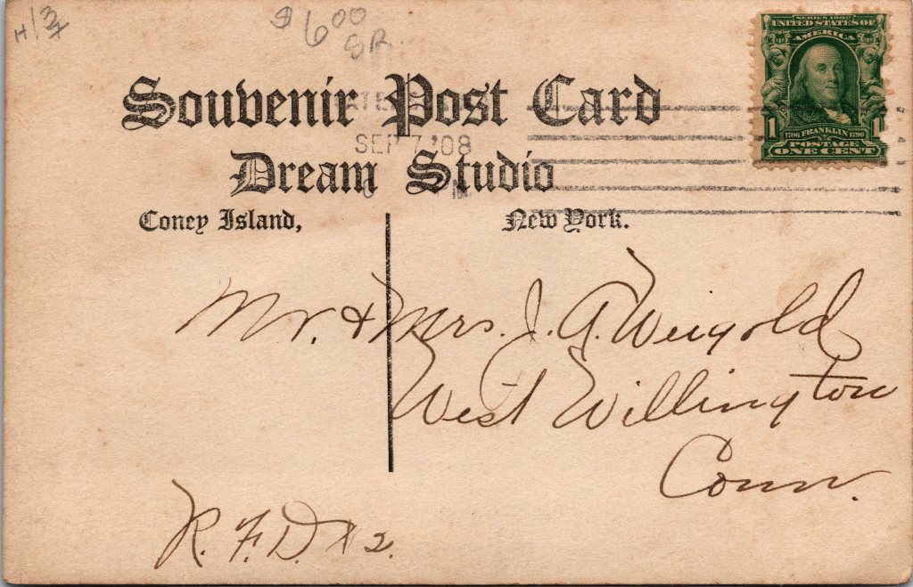 This vintage real photo postcard features a portrait of three visitors to Coney Island. Coney Island is a neighborhood and entertainment area in New York City’s borough of Brooklyn. The postmark on this card was stamped in 1908. By that time, Coney Island was well known for it’s amusement parks. In fact, between 1880 and World War II, Coney Island was the largest amusement area in the United States. The city of New York built a boardwalk to be utilized by visitors. Where there are boardwalks and amusement parks; there are photo studios. One of these studios was the “Dream Studio” and the threesome seen in this photo found their way there to create a souvenir memory. The “Dream Studio” was operated by Mr. H. Tarr. It was located on Surf Avenue at West 6th Street. The 1911 Dreamland Fire burned down Mr Tarr’s photo studio, but in a short time, it was reopened. SOLD
