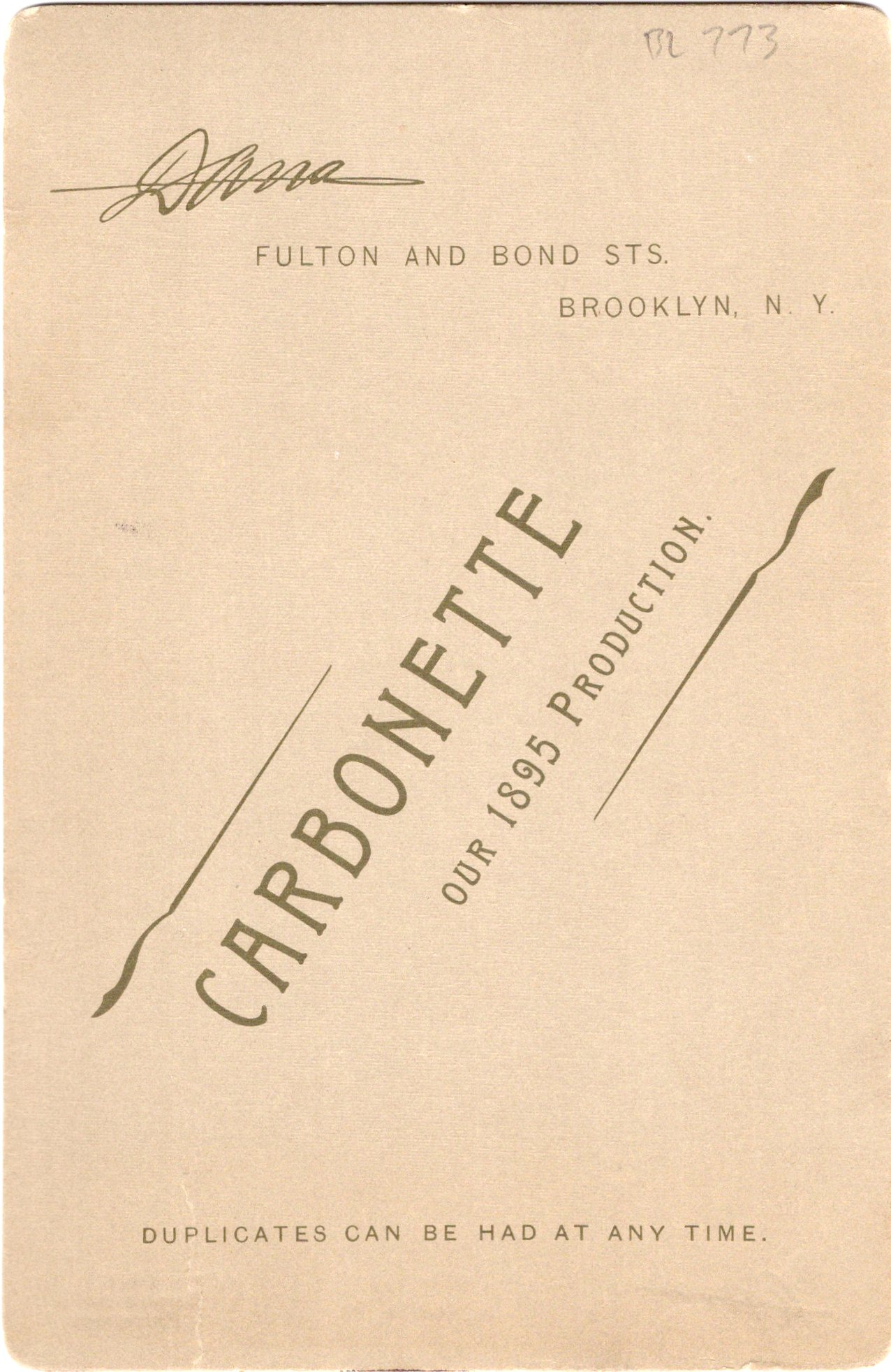 This cabinet card is a portrait of a young woman photographed by Harry, who advertised himself as the “leading photographer” of Steubenville, Ohio. The woman is wearing a ribbon around her collar as well as two pins. One pin is a horseshoe while the other appears to be some sort of clover. Perhaps these are good luck charms. Albert S. Harry (1848-1904) was born in Ohio and worked as a photographer in Wooster, Ohio through much of the 1870’s. In 1878, he settled in Steubenville and operated a studio until at least 1893. He later worked as a photographer in Brooklyn, New York. This cabinet card has corner wear and is in overall good condition (see scans).