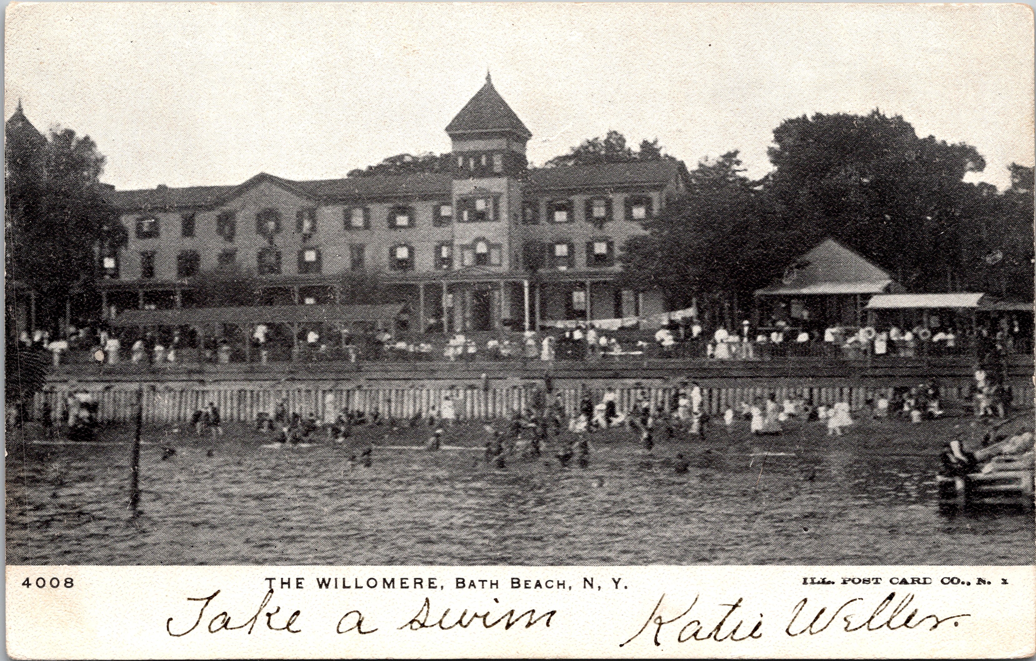 This vintage lithograph printed postcard features “The Willowmere, Bath Beach, New York”. Bath Beach was located in Brooklyn, New York. The postcard was published by the Ill. Postcard Co. which was located in New York. The card is part of a series (no.4008). The postcard is an undivided back card and was published circa 1905. The message on the postcard suggests the reader “take a swim”. SOLD