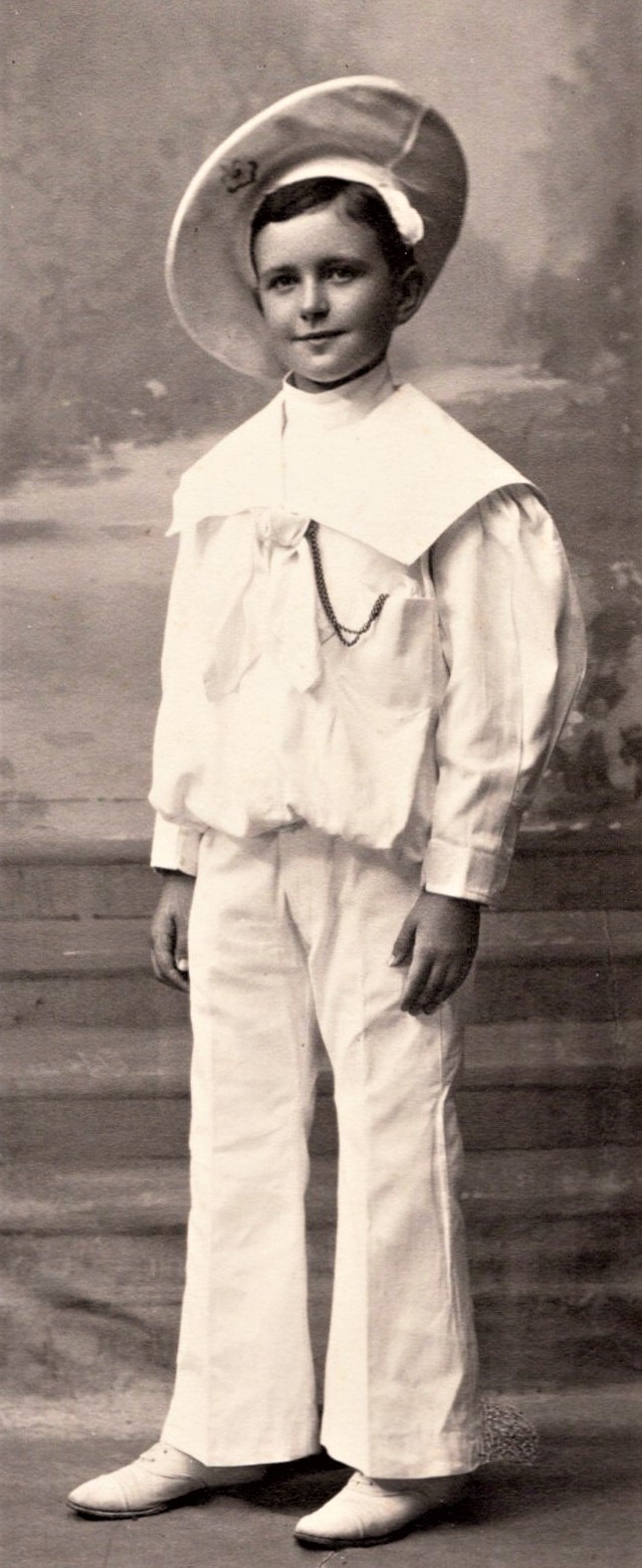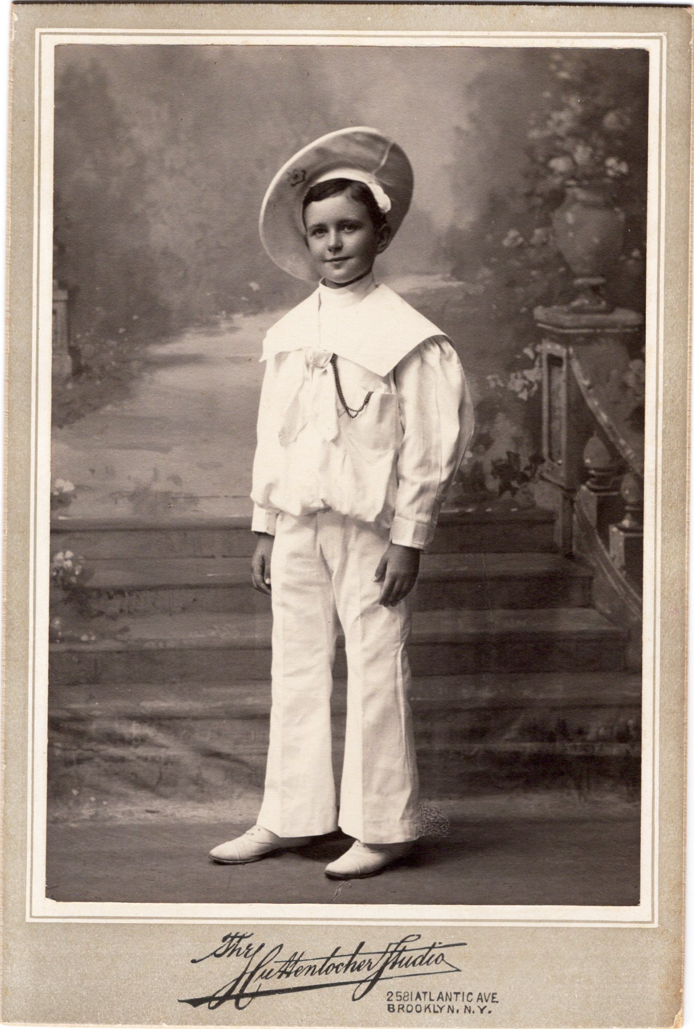 A young boy wearing a white dress naval uniform poses for a photographer in Brooklyn, New York. The photograph was produced by the Huttenlocher Studio. Note the lads interesting cap. One wonders whether the cap is part of a regulation uniform of a particular nation’s navy. The cap has an insignia on its brim. The meaning of the insignia is unknown. The photographer, Frederick Huttenlocher was mentioned in an article in the Telephone Review (1915) published by the New York Telephone Company. Mr Huttenlocher was presented as kind and as heroic. A company called the Patchogue Commercial Office, located in Brooklyn, New York, had a fire, causing the office to shut down. The company was across the street from Huttenlocher’s studio and due to Huttenlocher’s kindness, the Patchogue Commercial Office was able to open a temporary headquarters inside of the studio within thirty minutes after experiencing the fire. (SOLD)