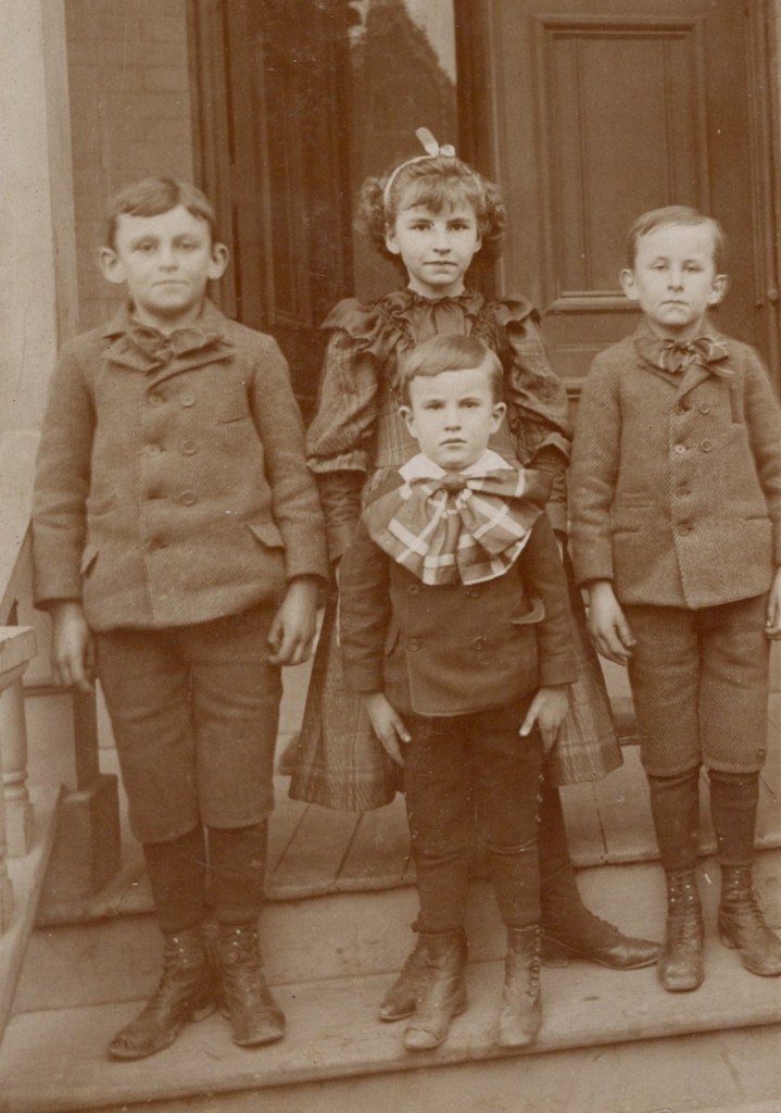 THREE YOUNG BROTHERS AND THEIR SISTER : STANDING ON A STOOP : BROOKLYN, NEW YORK