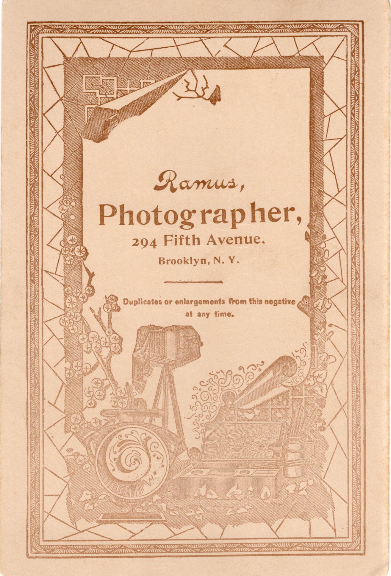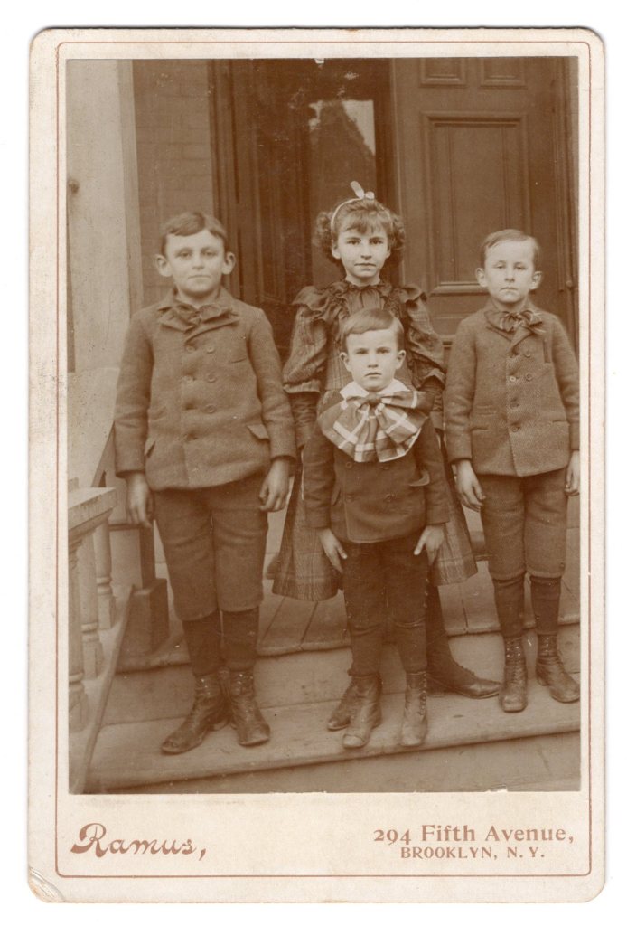 This cabinet card portrait features three young boys and a young girl. They are presumably siblings. Note the youngest boy’s plaid bow.. Large enough? The children are standing on a stoop. The photographer of this image is the Ramus studio of Brooklyn, New York. There is nice art on the reverse of the card. (SOLD)