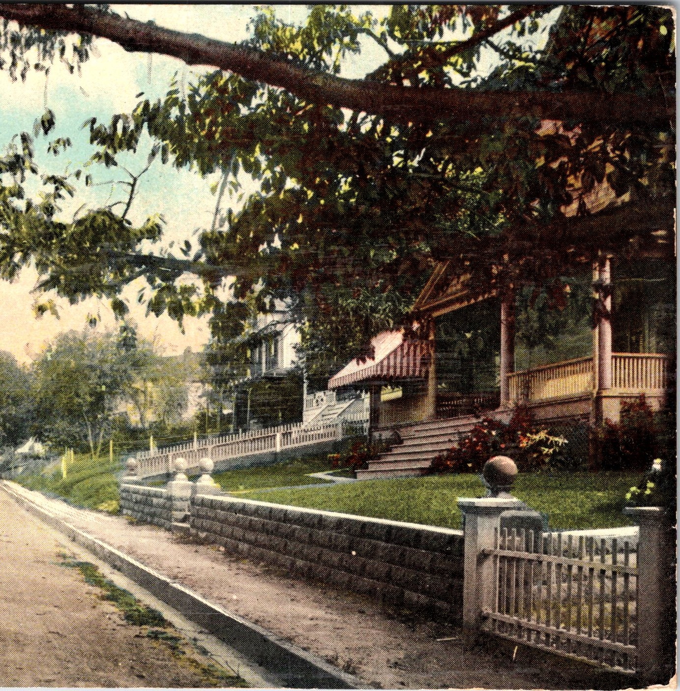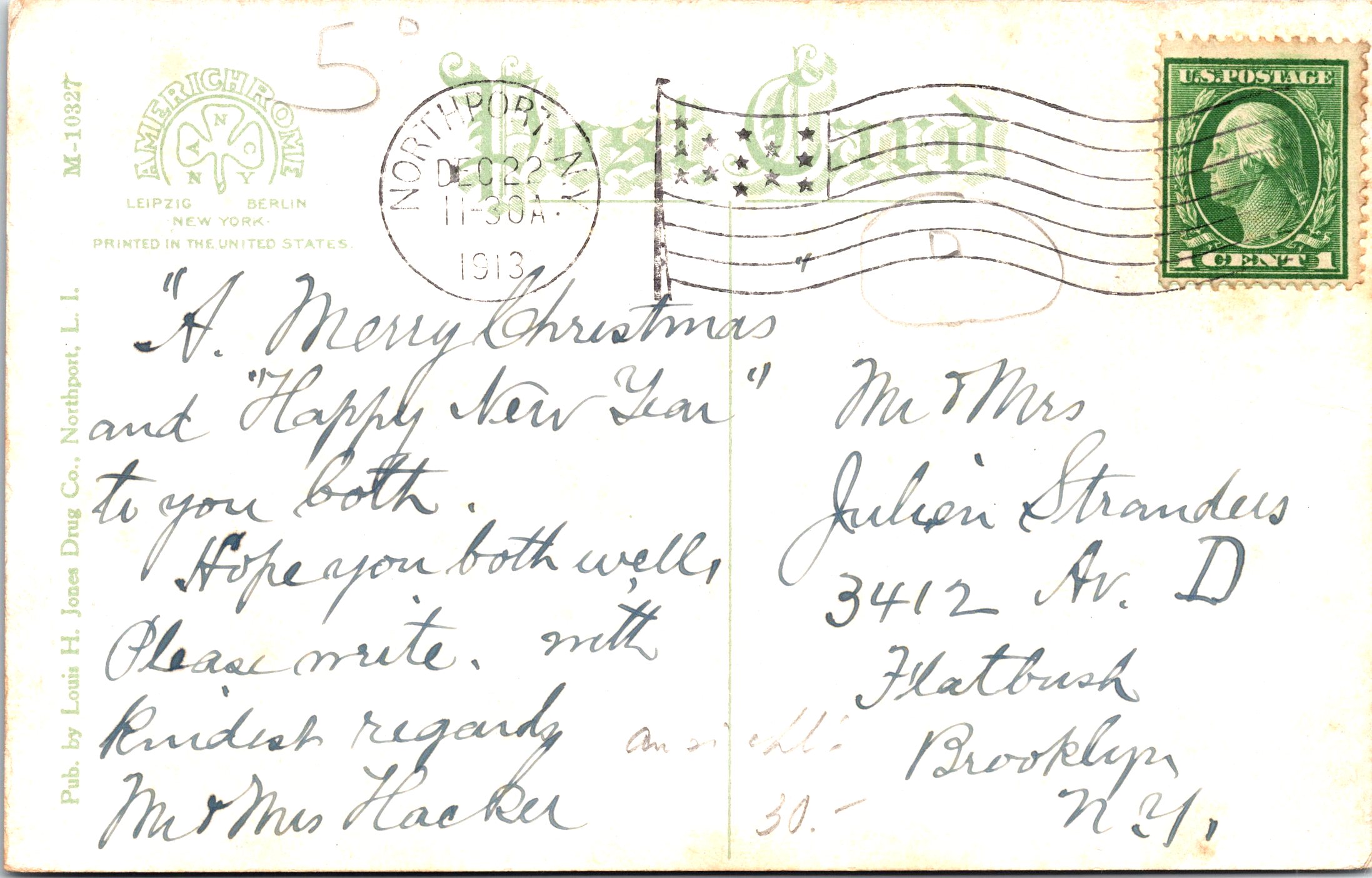 This lithographic postcard features a street scene in Northport, Long Island, New York. The postcard pictures Bayview Avenue in 1913. The road, sidewalk, houses and trees, look very much like the street looks today. The picturesque road runs along the edge of Northport Harbor (Long Island Sound), and was beautiful than, and beautiful now. This postcard was published by the Louis H. Jones Drug Company. The firm was located in Northport. The message includes holiday greetings and the addressee lived in Flatbush, Brooklyn, New York. SOLD