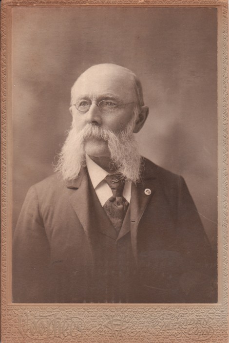 This cabinet card is a portrait of an older bespectacled gentleman with a significant mustache. He is well dressed and is wearing a pin on his lapel. The top of the pin seems to have a figure that looks like a buffalo or bucking bull. The print on the bottom of the pin is illegible. Hopefully, a visitor to this site will be able to provide more details about the lapel pin. The photographer of this image was H. C. Voorhees of Meriden, Connecticut. Voorhees liked to write instructional articles appearing in the era’s photographic journals. Among his articles were publications in Wilson’s Photographic Magazine (1891) and Photographic Mosaics (1896). To view other interesting photographs of remarkable mustaches, click on Cabinet Card Gallery’s category of “Mustaches (Only the Best).