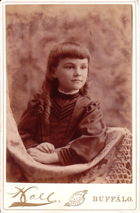 A young girl, with a look of confidence, poses for her portrait at the Hall & Co. studio in Buffalo, New York. The studio was located at 306 Main Street in Buffalo. The front and back of the card mentions the name “Powelson” which appears to be the name of the building that the studio was located in. Benjamin F. Powelson was a pioneer photographer in Buffalo beginning in the 1840’s. E. F. Hall took this photograph between 1889 and 1895. The reverse of this card indicates that Hall won an award in 1889 and research reveals that he opened a new studio in 1895, in another location in Buffalo. Hall was elected an officer in the Buffalo camera club in 1889.