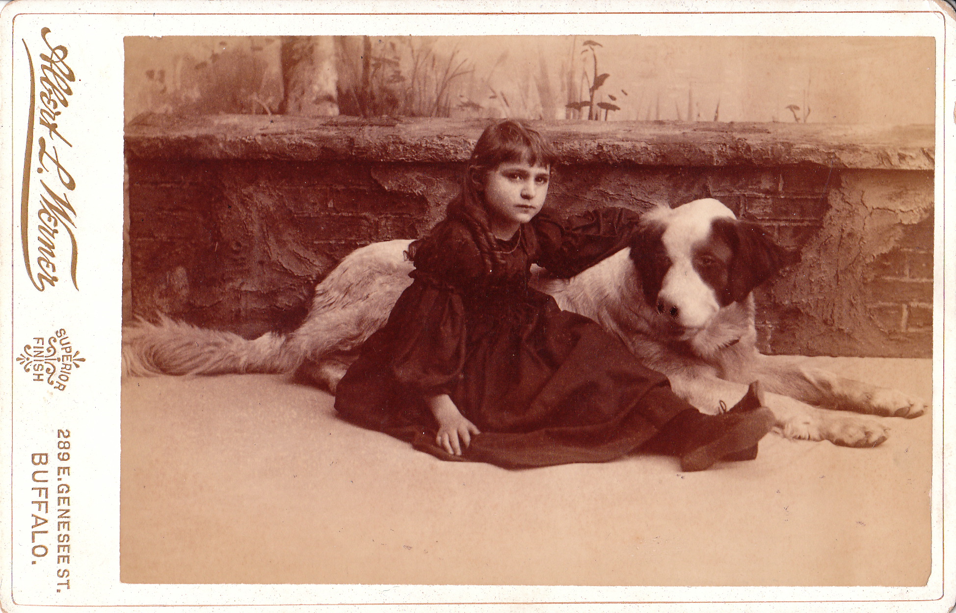A young girl poses with her huge St. Bernard at the studio of Albert L. Werner in Buffalo, New York. The long haired young girl in her dark dress sits with her arm partially around the outstretched dog. The dog appears to be a St. Bernard. The studio backdrop is faux garden or park type setting wall. Albert L. Werner’s name is still prominent in Buffalo. The Werner Photography Building stands in the Genesee neighborhood of Buffalo. The building is considered a work of “artistic architecture”. It was constructed in 1895 and was designed by internationally prominent Buffalo architect, Richard A. Waite. Werner was a popular photographer of German descent who began operating a photographic studio in 1890, He relocated his business into the Werner Building in 1896. Some historians believe that the building may have been designed with him and his business in mind and the building certainly was assigned his name. Werner left the building in 1899, but his name remained on the building throughout modern times. The signage with his name was recently repainted. To view other photographs by Werner, click on the category “Photographer: Werner”.