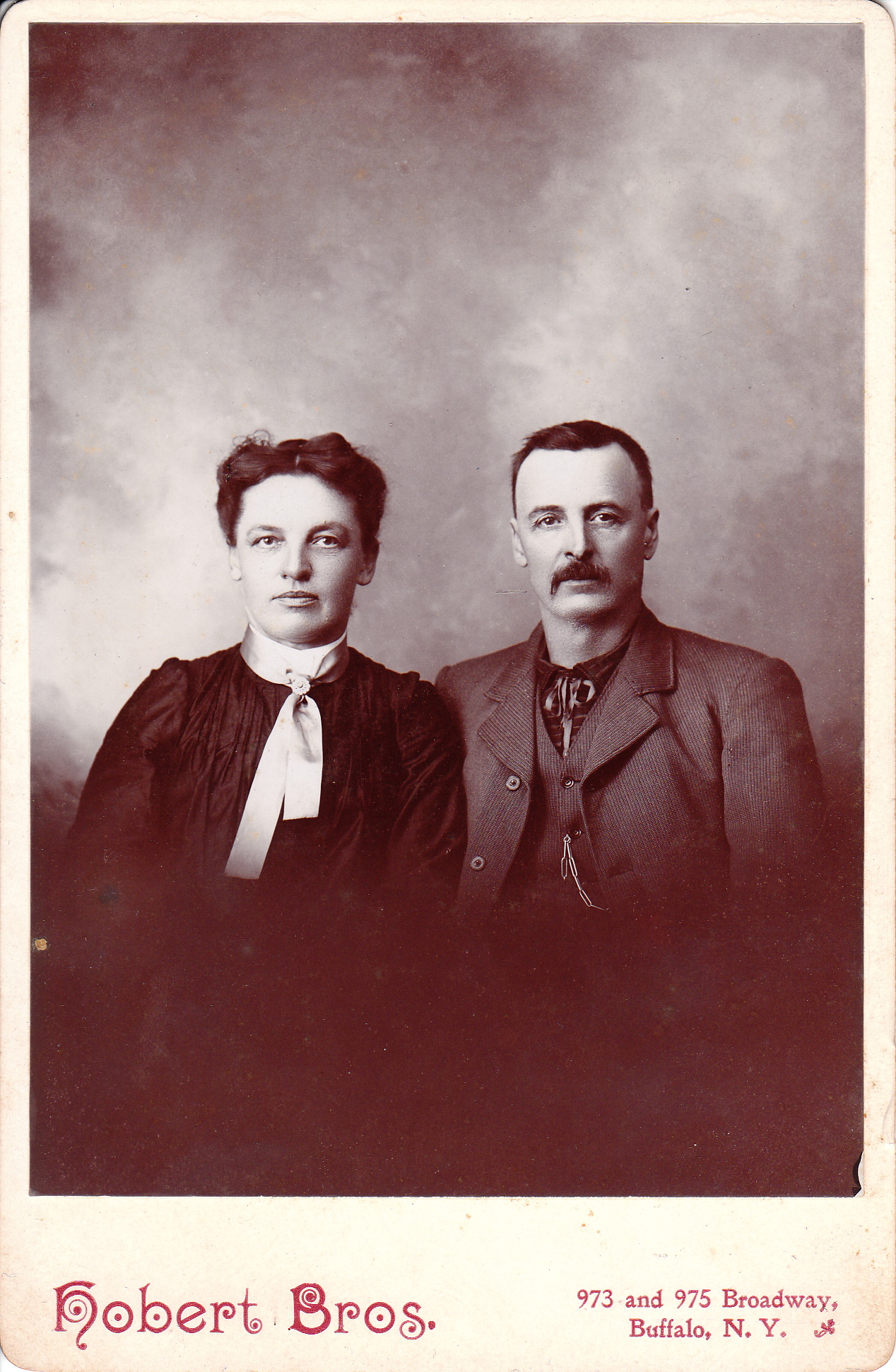 This cabinet card features a well-dressed handsome couple posing for their portrait at Hobert Brother’s Studio. The studio was located in Buffalo, New York. The Buffalo city directory lists Adam, A. S., W.F., and Stanley Hobert as working at the address of the photographic gallery. It is possible that A. S. Hobert may be Adam Stanley Hobert. Therefore, it is not clear how many Hobert Brothers were proprietors of the studio. (SOLD)