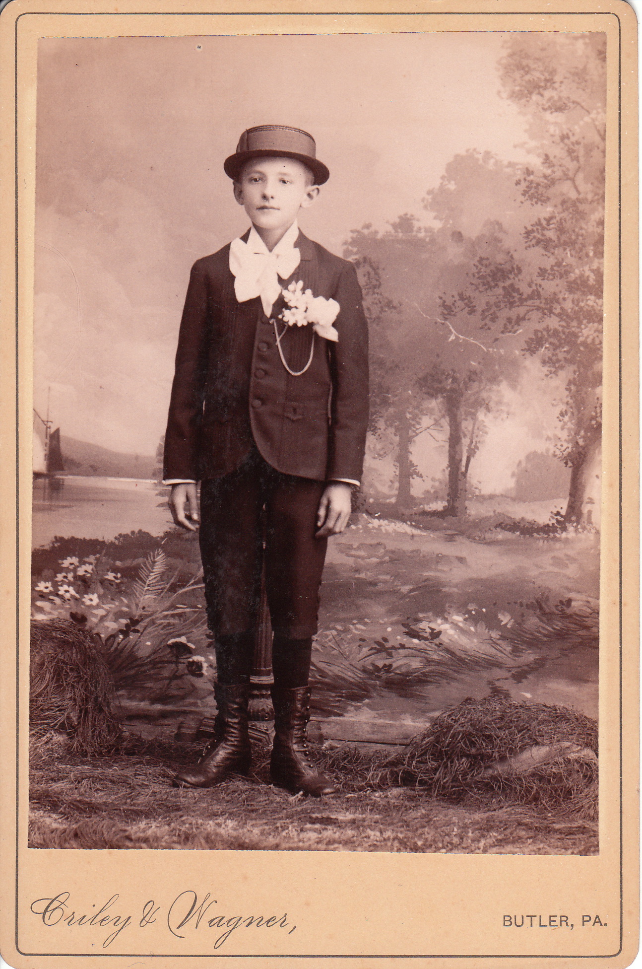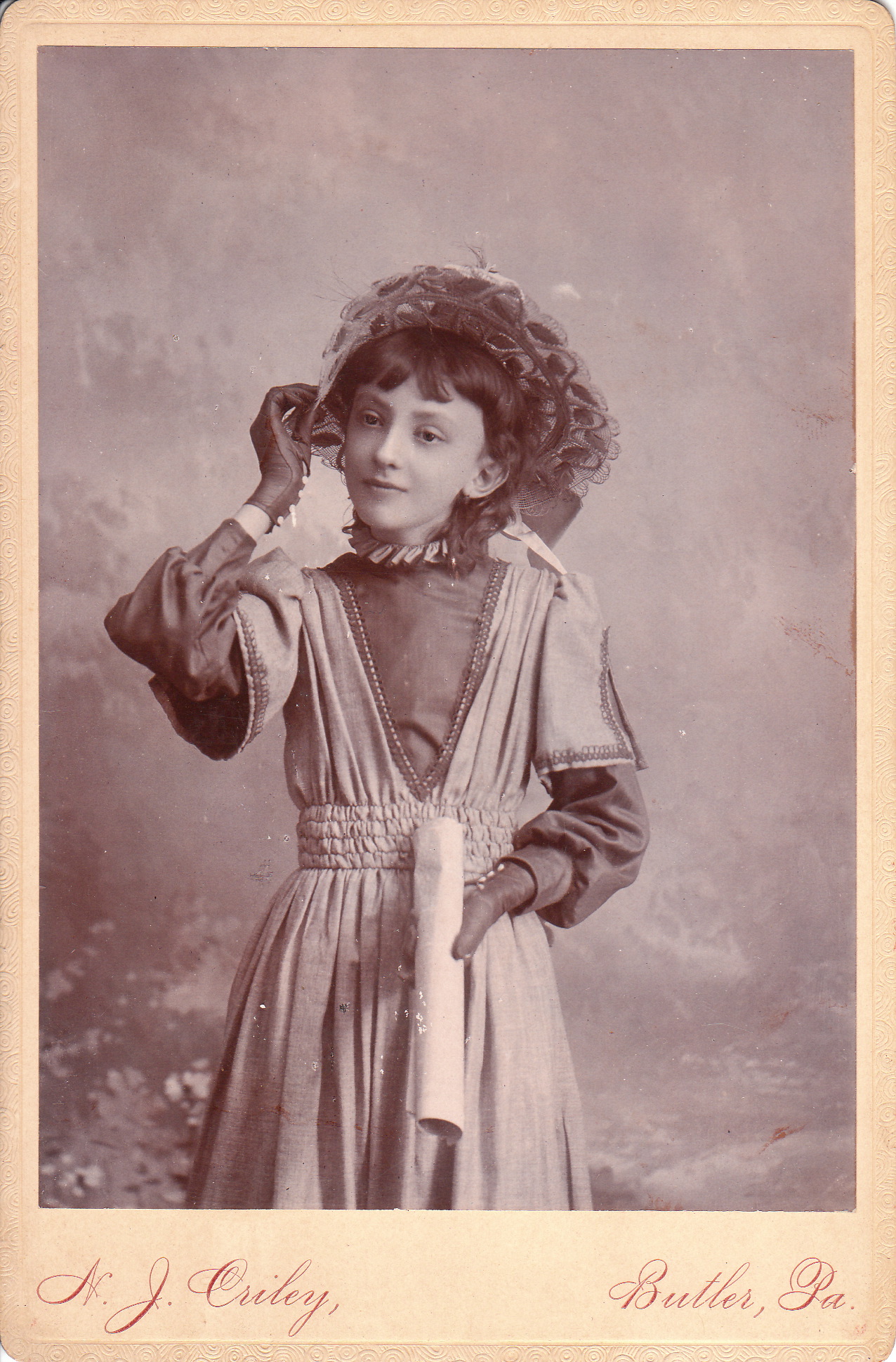 Grapes? Paper Bags? When did paper bags get invented anyway? Why did the photographer choose to photograph four teenage girls eating grapes? Is there some kind of symbolism in the image or is it meant to just show four girls enjoying a picnic? This cabinet card photograph presents a number of interesting questions and I can only answer one of them. Paper bags were invented in 1852. At least that is when Frances Wolle patented the machine that manufactured paper sacks and founded the Union Paper Bag Company. The reverse of this cabinet card has an inscription stating “Stella Pape, 1888”. Stella was actually her nickname. Her given name was Destella L. Pape and she was born in 1872. She was about sixteen years of age at the time of this photograph. In the 1900 US census she was living with her mother (Mary) and older brother (Nielson) in Butler, Pennsylvania She later married George Reiber who was a man twenty-one years her senior. The couple had a son in 1905 who was named after his father (George). Stella Pape died in Pittsburg, Pennsylvania in 1956. She was buried with her son (see the photograph of her gravestone below). The photographers of this image are Criley & Wagner. To view more of their images, click on the category “Photographer: Criley & Wagner”.