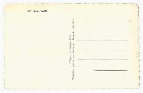 Postcard 2 is a risque photograph of Miss Tani. She is wearing the same robe as the one she wears in Postcard 1. It is strategically ill fitting. The postcard is made in Paris and published by the globe as part of a series no.469). The photographer is Sam Levin. SOLD
