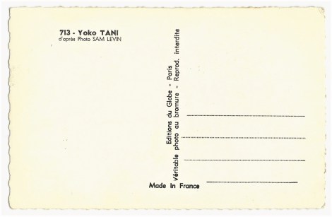Postcard 1 showcases the beauty of Yoko Tani. This photograph is certainly a “cheesecake” image. Tani seems to be falling out of her robe (kimono). Let there be no doubt, sex sells. This was true in the 1950’s and 1960’s as well as today. Unfortunately, women were, and are, seen as objects. This vintage real photo postcard was made in France and published by the “Globe”. The card was part of a series (no.713). The photograph was taken by famed celebrity photographer Sam Levin. Levin was popular both in Europe as well as the United States. This photo postcard is in very good condition (see scans).