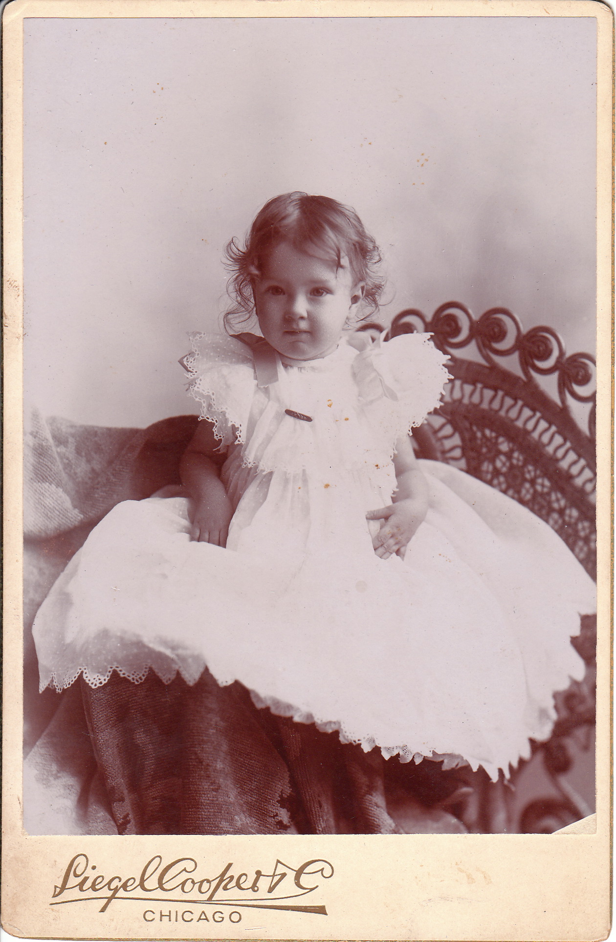 This cabinet card photograph is a portrait of a very sweet and adorable little girl posing in the studio of Siegel Cooper in Chicago Illinois. She appears a bit fearful but at the same time she appears to be interested in what is happening around her. She is perched on a wicker chair. Check out the category of “Photographer: Siegel Cooper” to see other photographs by this studio.