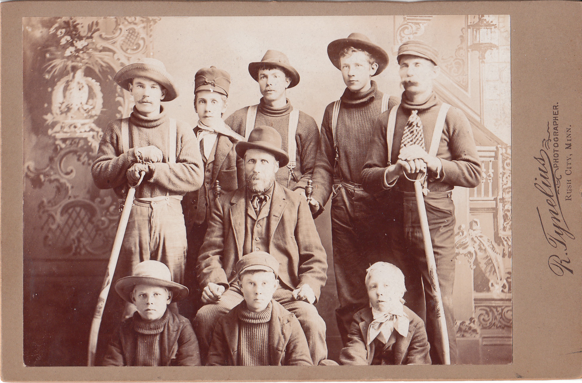 A group of men and boys pose for their portrait at the photographic studio of R. Tynelius of Rush City, Minnesota. This photograph stimulates a lot of interesting questions. Is this a family or some other type of unit? What are the tools that the men are holding? What is the occupation of these photographic subjects? Are they farmers? All of the subjects in this image are wearing a hat which suggests that their occupation requires working outside. The photographer, R. Tynelius is mentioned in a publication called “The St. Louis and Canadian Photographer” (1900). It was reported that he was succeeding Mr E. J. Almquist in running a photography studio.