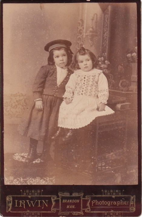This Cabinet Card is an image of what appears to be two sisters; the oldest wearing a sailors hat. They were photographed by the Irwin Studio in Brandon, Manitoba (Canada). The oldest girl is standing on a stool. The younger girl is wearing a beautiful embroidered dress. Research reveals that the photographers studio was located on Rosser Street in Brandon.