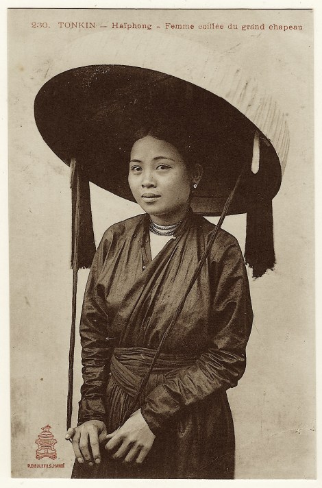 This vintage real photo postcard features a pretty Vietnamese woman wearing an extremely large hat. She is dressed in the custom of her country and her era. The text on the postcard indicates that she was photographed in Haiphong, a major port city in northeastern Vietnam. The postcard was published by P. Dieulefils of Hanoi, Vietnam. Pierre Dieulefils was the first established professional photographer in Hanoi. In addition, he was a postcard editor and explorer. He had an excellent reputation as a photographer throughout Europe and Indochina. He won many medals at Universal Exhibitions. It is estimated that he produced approximately five thousand photos and postcards and he is considered one of the greatest photographers of the region. His photographic expeditions included such locales as Vietnam, China, and Cambodia. The Cabinet Card Gallery has a nice collection of early Vietnam (Tonkin) postcards that can be viewed by putting the word “Vietnam” in the blog’s search box. SOLD