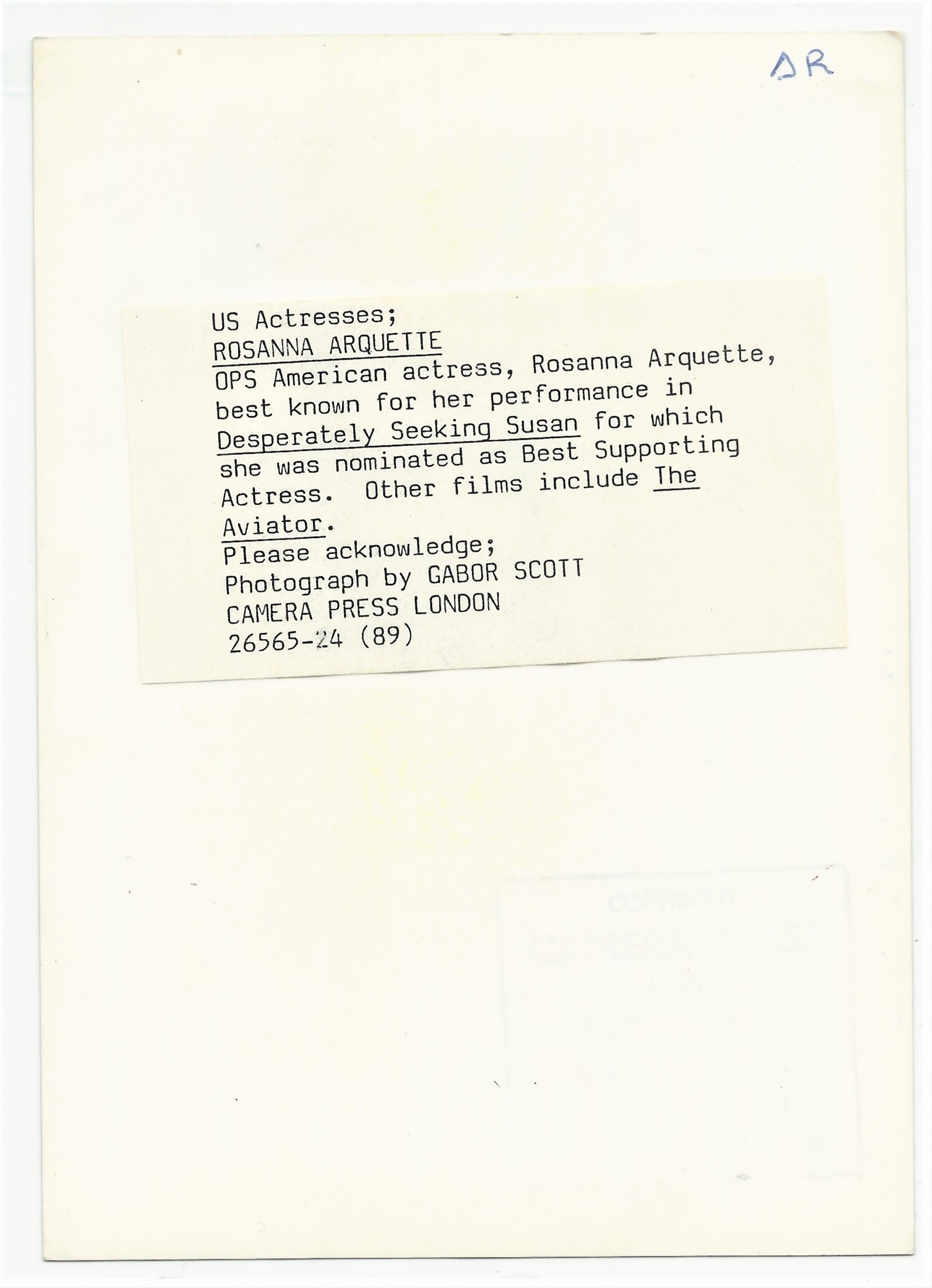 This press photo features award-winning actress (film and television), film director, and film producer, Rosanna Arquette (1959- ). Her movie credits include roles in “Desperately Seeking Susan” (1985), “Pulp Fiction” (1994), and David Cronenberg’s Crash (1996). Arquette was born in New York City. Her mother was an actress, poet, therapist, and more. Her father is a film actor, screenwriter, and producer. Her grandfather (Charley Weaver) was a comedian. She has four siblings that became actors. Must be in the genes. Arquette was one of the victims of Harvey Weinstein’s predatory sexual behavior and she spoke out about her experience early on when Weinstein was being deservedly skewered by the press. She has been married four times and divorced three times. While making a film with Bette Davis in 1978, Arquette was advised by the apparently prescient screen star that mixing a career and a relationship would never work. In 1990 Arquette was on the cover and featured in a nude pictorial for Playboy magazine. The IMDb credits her with 152 acting credits and 3 for directing. This silver print photograph was taken by celebrity photographer, Gabor Scott, in 1989. It is my presumption that the number 89 printed on the reverse of the photo stands for 1989. The Press Gazette reported Gabor’s death in 2014. He was 65 years-old. The article’s headline asserts that he “made his name covering 1980’s glitterati”. The London based photographer once photographed Prince Harry giving him “the finger”. He was the “house photographer” at Camden Palace, one of the most fashionable London clubs in the 80’s. He photographed many celebrities there and elsewhere. Scott was born in Hungary in 1948 and moved with his family to London in 1956. Scott syndicated his images through a number of agencies. This press photo was distributed by Camera Press. The photo measures about 5″ x 7″ and is in excellent condition (see scans).