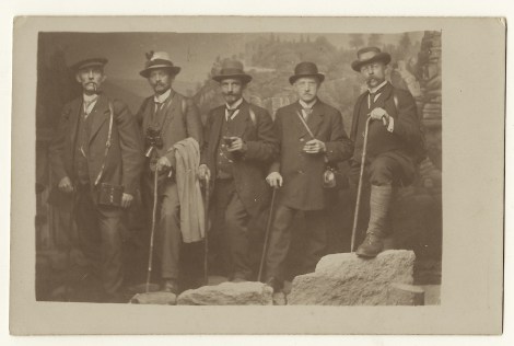 This vintage real photo postcard features five men in their hiking attire. They certainly don’t seem to be wearing very comfortable clothing for a hike. I hope there was no scrambling or navigating slippery portions of the trail required. If so, their suit pants won’t have a long life span. Other than wearing clothing that may hamper their efforts, the men are well equipped with binoculars and walking sticks. The men have cases for the binoculars and the gentleman all the way on the left has a larger bag slung over his shoulder. The men are also well supplied with smoking materials. Two of the men have cigarettes/cigars and two others are holding a pipe. Interestingly, mustaches must have been in vogue considering that each of the men are wearing one. Hats must have been equally popular. It would be fascinating to know the story of this gathering of outdoorsmen. The former owner of this image believes that the men are tourists, but he offers no supporting evidence. This vintage photo postcard is in very good condition (see scans).