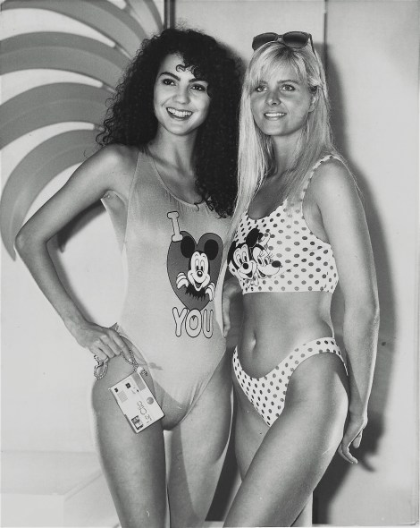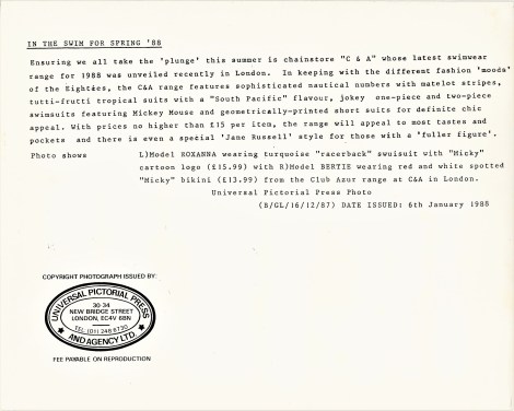 This 1988 press photo features two beautiful young women modelling swimsuits for the international retail clothing firm, “C & A”. Model, Roxanna Hudson is wearing a “turquoise racerback swimsuit” with a Mickey “I Love You” logo. The second model, “Bertie”, is wearing a red and white spotted bikini with a Mickey and Minnie logo. It is interesting to note that Miss Hudson is holding a “Le Clic” camera. Produced by Keystone, these cameras were fashionable and inexpensive. Manufactured in the late 1980’s, they had Kodak Disc technology and were easy to load and had a reusable flash. This photograph was published by Universal Pictorial Press. The publisher was located in London, England. Twenty-eight portraits from Universal can be found in the United Kingdom’s National Portrait Gallery. This press photograph has wonderful clarity and is in very good condition (see scans).
