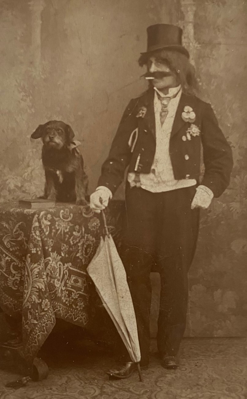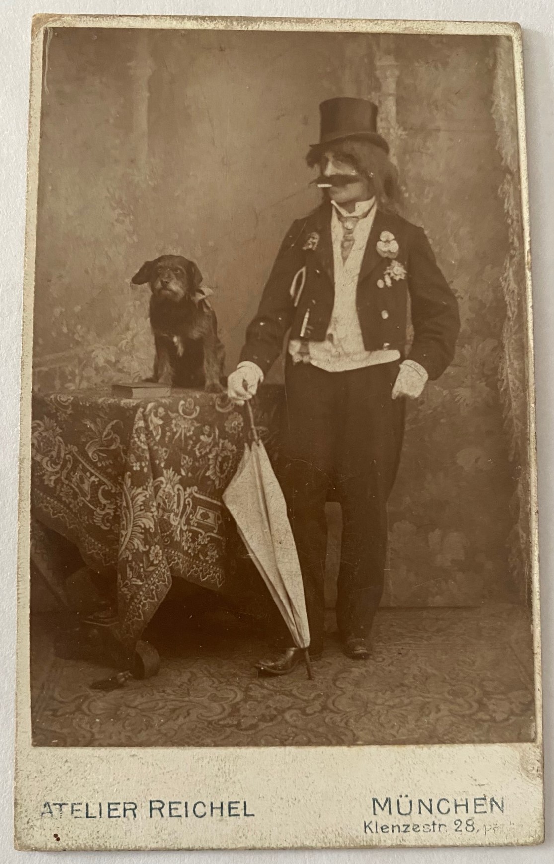 This carte de visite photograph features a clown in his clown costume. He is dressed like a hobo with the exception of his top hat. Note that he is wearing eye glasses and is smoking a cigarette. The clown is posing with his small dog on a table beside him. This clown and his dog are likely members of a circus troupe. This cdv photograph was taken at the Reichel studio in Munich, Germany. The reverse of the photo lists the photographer as Anton Putterich. It is likely that one of these gentlemen succeeded the other in operating the studio. SOLD